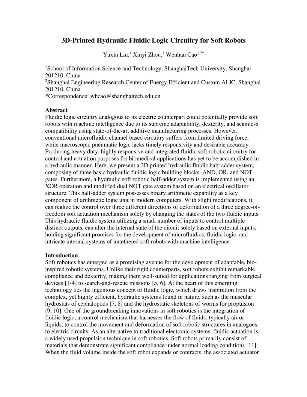 3D-Printed Hydraulic Fluidic Logic Circuitry for Soft Robots