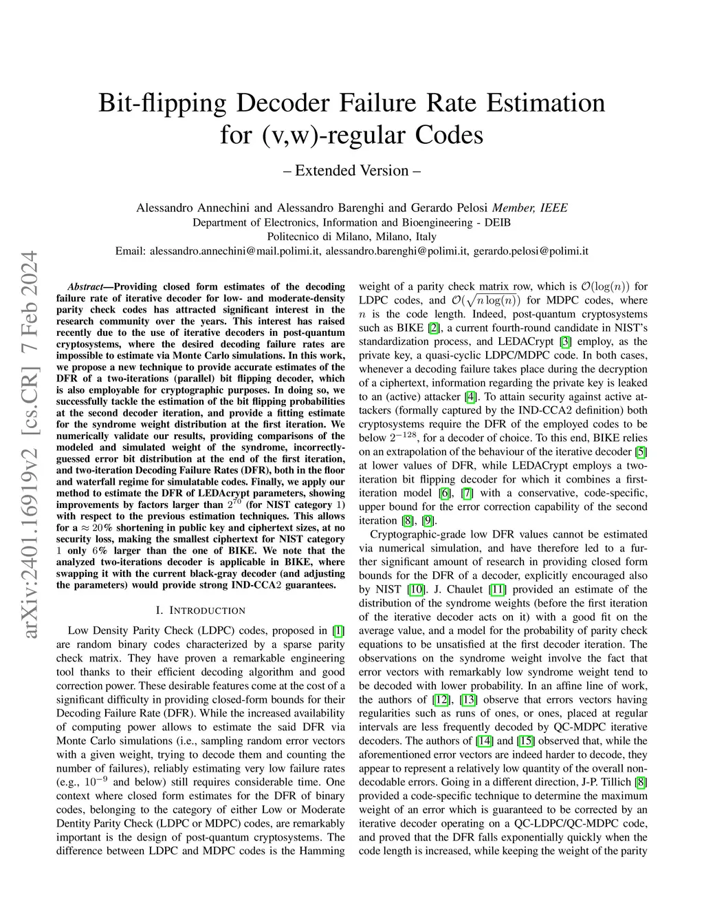 Providing closed-form estimates of the decoding failure rate of iterative decoders for low- and moderate-density binary parity-check codes has attracted significant interest in the research community. Recently, interest in this topic has increased due to the use of iterative decoders in post-quantum cryptosystems, where the desired decoding failure rates (DFRs) are less than or equal to and impossible to estimate via Monte Carlo simulations. We propose a new technique that provides accurate DFR estimates for a two-iteration (parallel) bit-flipping decoder that can be used for cryptographic purposes. We estimate the bit-flipping probabilities at the second decoder iteration and the syndrome weight distribution before and after the first iteration as a function of the code parameters and error weight. We validate our results numerically by comparing the modelled and simulated syndrome weights, the incorrectly guessed error bit distribution at the end of the first iteration, and the DFR after two iterations in both the floor and waterfall regimes. Finally, we apply our method to estimate the DFR of the LEDAcrypt cryptographic system, a post-quantum key encapsulation method that employs a two-iteration bit-flipping decoder. We show that the DFR estimate resulting from the chosen code parameters can be improved by a factor larger than with respect to previous estimation techniques, when -bit security is required. This allows for a % reduction in public key and ciphertext sizes at no security loss. We note that our results can be applied to the post-quantum cryptosystem known as Bit Flipping Key Encapsulation (BIKE) replacing the current ``BIKE-flip decoder'' with the two-iteration decoder and consequently endowing BIKE with the property of indistinguishability under an adaptive chosen-ciphertext attack (IND-CCA), provably.