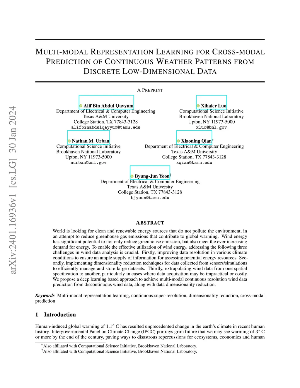 World is looking for clean and renewable energy sources that do not pollute the environment, in an attempt to reduce greenhouse gas emissions that contribute to global warming. Wind energy has significant potential to not only reduce greenhouse emission, but also meet the ever increasing demand for energy. To enable the effective utilization of wind energy, addressing the following three challenges in wind data analysis is crucial. Firstly, improving data resolution in various climate conditions to ensure an ample supply of information for assessing potential energy resources. Secondly, implementing dimensionality reduction techniques for data collected from sensors/simulations to efficiently manage and store large datasets. Thirdly, extrapolating wind data from one spatial specification to another, particularly in cases where data acquisition may be impractical or costly. We propose a deep learning based approach to achieve multi-modal continuous resolution wind data prediction from discontinuous wind data, along with data dimensionality reduction.