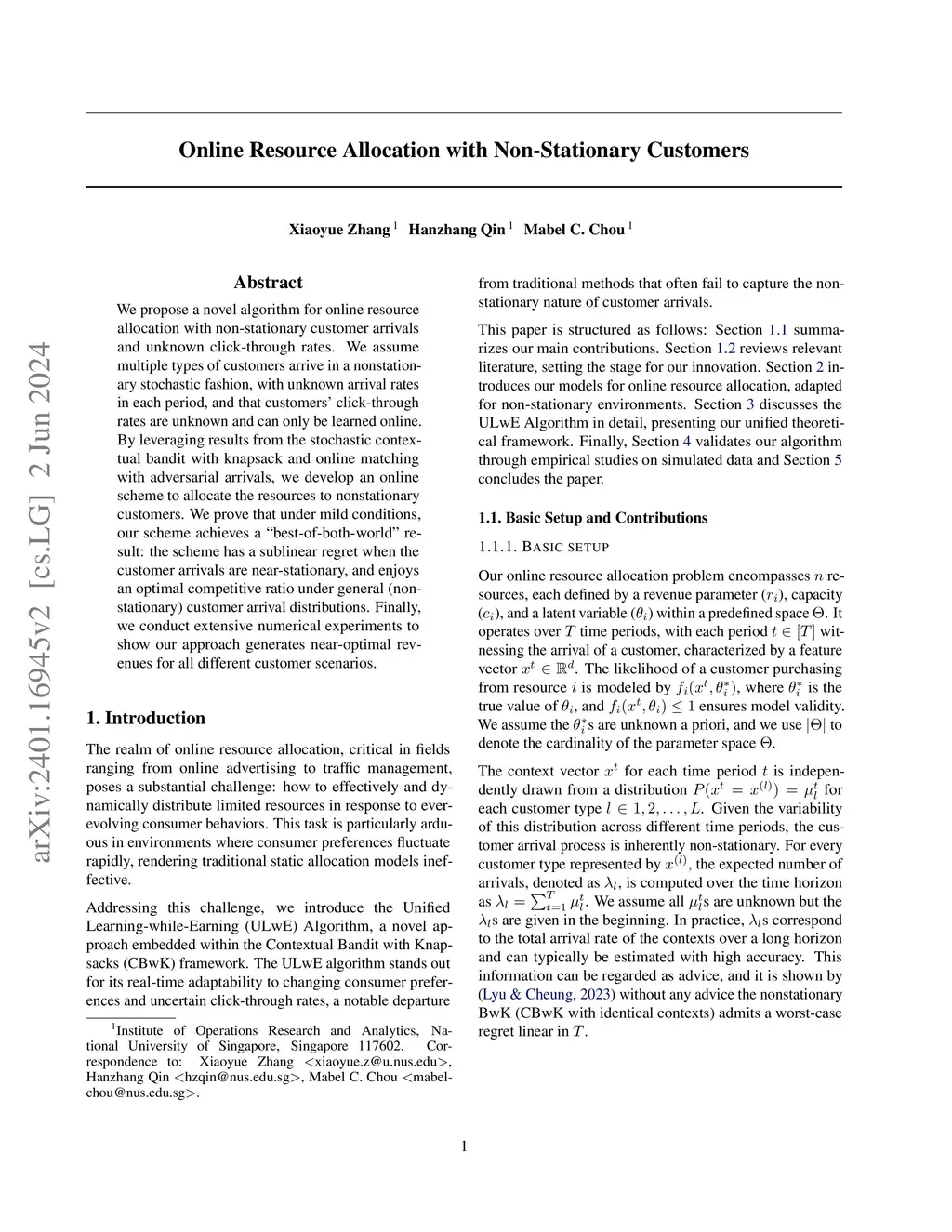 We propose a novel algorithm for online resource allocation with non-stationary customer arrivals and unknown click-through rates. We assume multiple types of customers arrive in a nonstationary stochastic fashion, with unknown arrival rates in each period, and that customers' click-through rates are unknown and can only be learned online. By leveraging results from the stochastic contextual bandit with knapsack and online matching with adversarial arrivals, we develop an online scheme to allocate the resources to nonstationary customers. We prove that under mild conditions, our scheme achieves a ``best-of-both-world'' result: the scheme has a sublinear regret when the customer arrivals are near-stationary, and enjoys an optimal competitive ratio under general (non-stationary) customer arrival distributions. Finally, we conduct extensive numerical experiments to show our approach generates near-optimal revenues for all different customer scenarios.