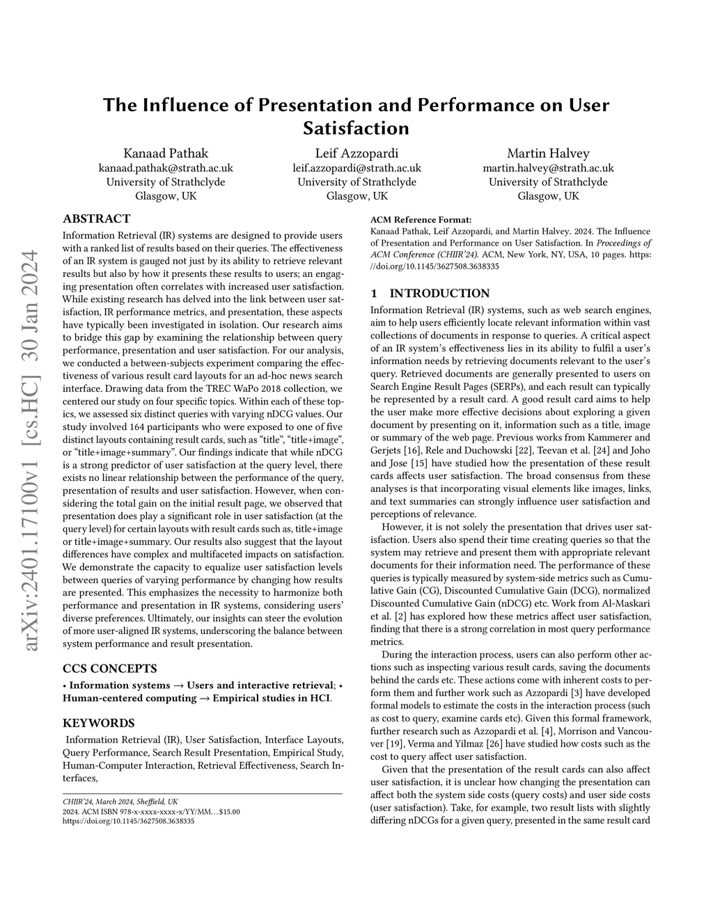 The effectiveness of an IR system is gauged not just by its ability to retrieve relevant results but also by how it presents these results to users; an engaging presentation often correlates with increased user satisfaction. While existing research has delved into the link between user satisfaction, IR performance metrics, and presentation, these aspects have typically been investigated in isolation. Our research aims to bridge this gap by examining the relationship between query performance, presentation and user satisfaction. For our analysis, we conducted a between-subjects experiment comparing the effectiveness of various result card layouts for an ad-hoc news search interface. Drawing data from the TREC WaPo 2018 collection, we centered our study on four specific topics. Within each of these topics, we assessed six distinct queries with varying nDCG values. Our study involved 164 participants who were exposed to one of five distinct layouts containing result cards, such as "title'', "title+image'', or "title+image+summary''. Our findings indicate that while nDCG is a strong predictor of user satisfaction at the query level, there exists no linear relationship between the performance of the query, presentation of results and user satisfaction. However, when considering the total gain on the initial result page, we observed that presentation does play a significant role in user satisfaction (at the query level) for certain layouts with result cards such as, title+image or title+image+summary. Our results also suggest that the layout differences have complex and multifaceted impacts on satisfaction. We demonstrate the capacity to equalize user satisfaction levels between queries of varying performance by changing how results are presented. This emphasizes the necessity to harmonize both performance and presentation in IR systems, considering users' diverse preferences.