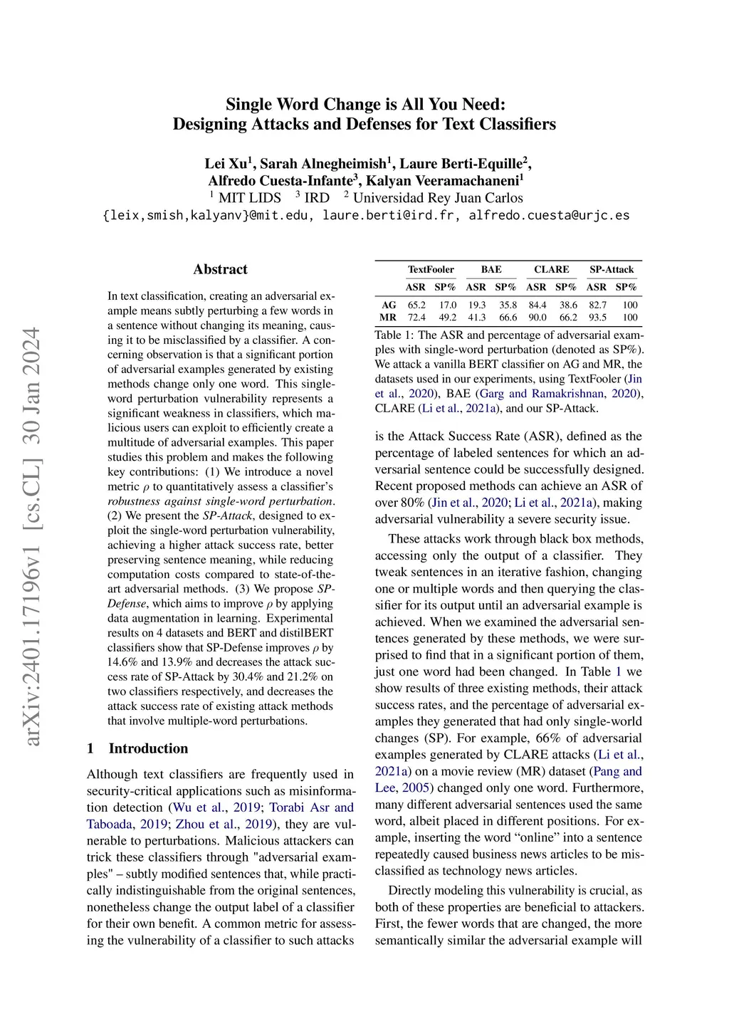 In text classification, creating an adversarial example means subtly perturbing a few words in a sentence without changing its meaning, causing it to be misclassified by a classifier. A concerning observation is that a significant portion of adversarial examples generated by existing methods change only one word. This single-word perturbation vulnerability represents a significant weakness in classifiers, which malicious users can exploit to efficiently create a multitude of adversarial examples. This paper studies this problem and makes the following key contributions: (1) We introduce a novel metric to quantitatively assess a classifier's robustness against single-word perturbation. (2) We present the SP-Attack, designed to exploit the single-word perturbation vulnerability, achieving a higher attack success rate, better preserving sentence meaning, while reducing computation costs compared to state-of-the-art adversarial methods. (3) We propose SP-Defense, which aims to improve \r{ho} by applying data augmentation in learning. Experimental results on 4 datasets and BERT and distilBERT classifiers show that SP-Defense improves by 14.6% and 13.9% and decreases the attack success rate of SP-Attack by 30.4% and 21.2% on two classifiers respectively, and decreases the attack success rate of existing attack methods that involve multiple-word perturbations.