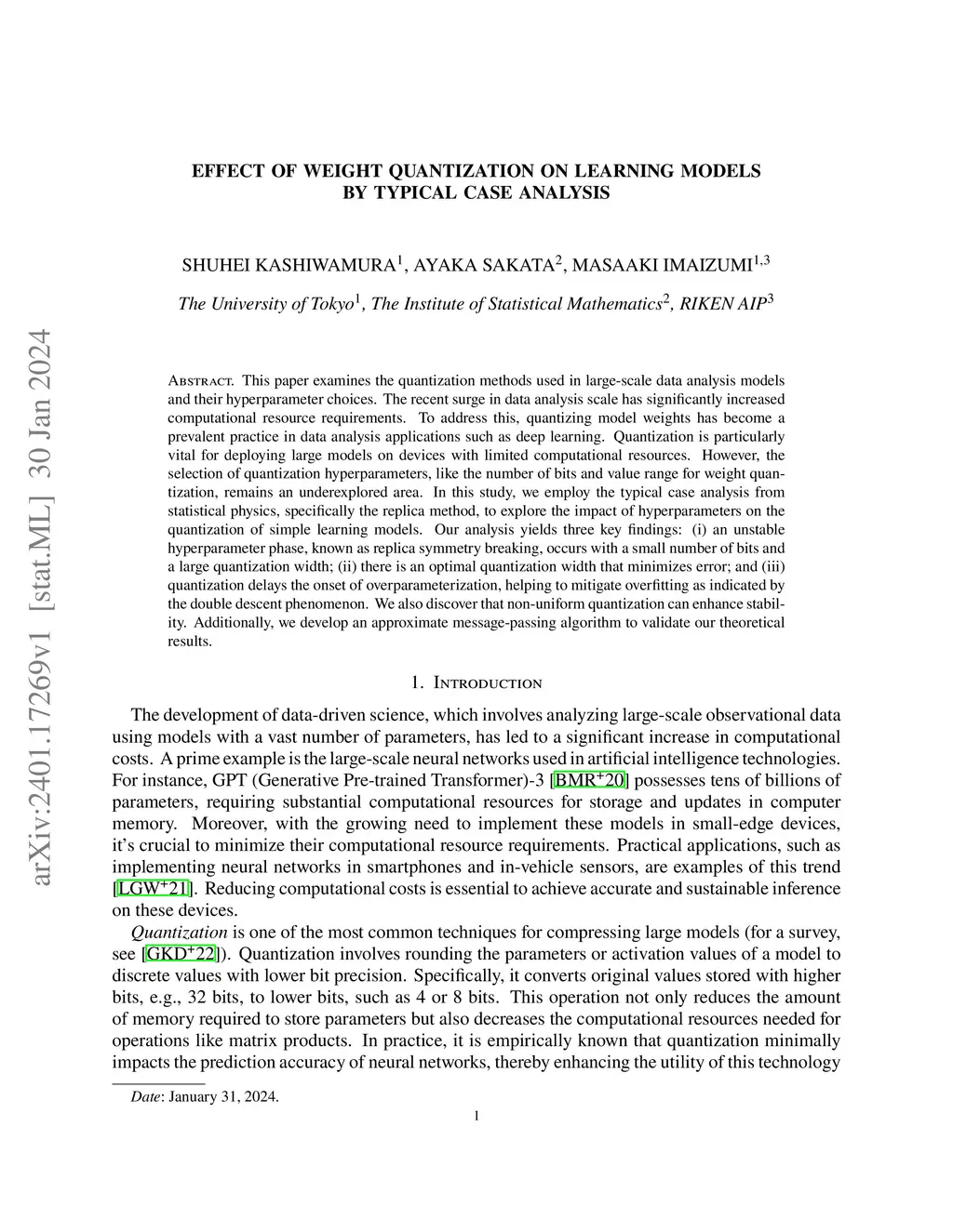 This paper examines the quantization methods used in large-scale data analysis models and their hyperparameter choices. The recent surge in data analysis scale has significantly increased computational resource requirements. To address this, quantizing model weights has become a prevalent practice in data analysis applications such as deep learning. Quantization is particularly vital for deploying large models on devices with limited computational resources. However, the selection of quantization hyperparameters, like the number of bits and value range for weight quantization, remains an underexplored area. In this study, we employ the typical case analysis from statistical physics, specifically the replica method, to explore the impact of hyperparameters on the quantization of simple learning models. Our analysis yields three key findings: (i) an unstable hyperparameter phase, known as replica symmetry breaking, occurs with a small number of bits and a large quantization width; (ii) there is an optimal quantization width that minimizes error; and (iii) quantization delays the onset of overparameterization, helping to mitigate overfitting as indicated by the double descent phenomenon. We also discover that non-uniform quantization can enhance stability. Additionally, we develop an approximate message-passing algorithm to validate our theoretical results.