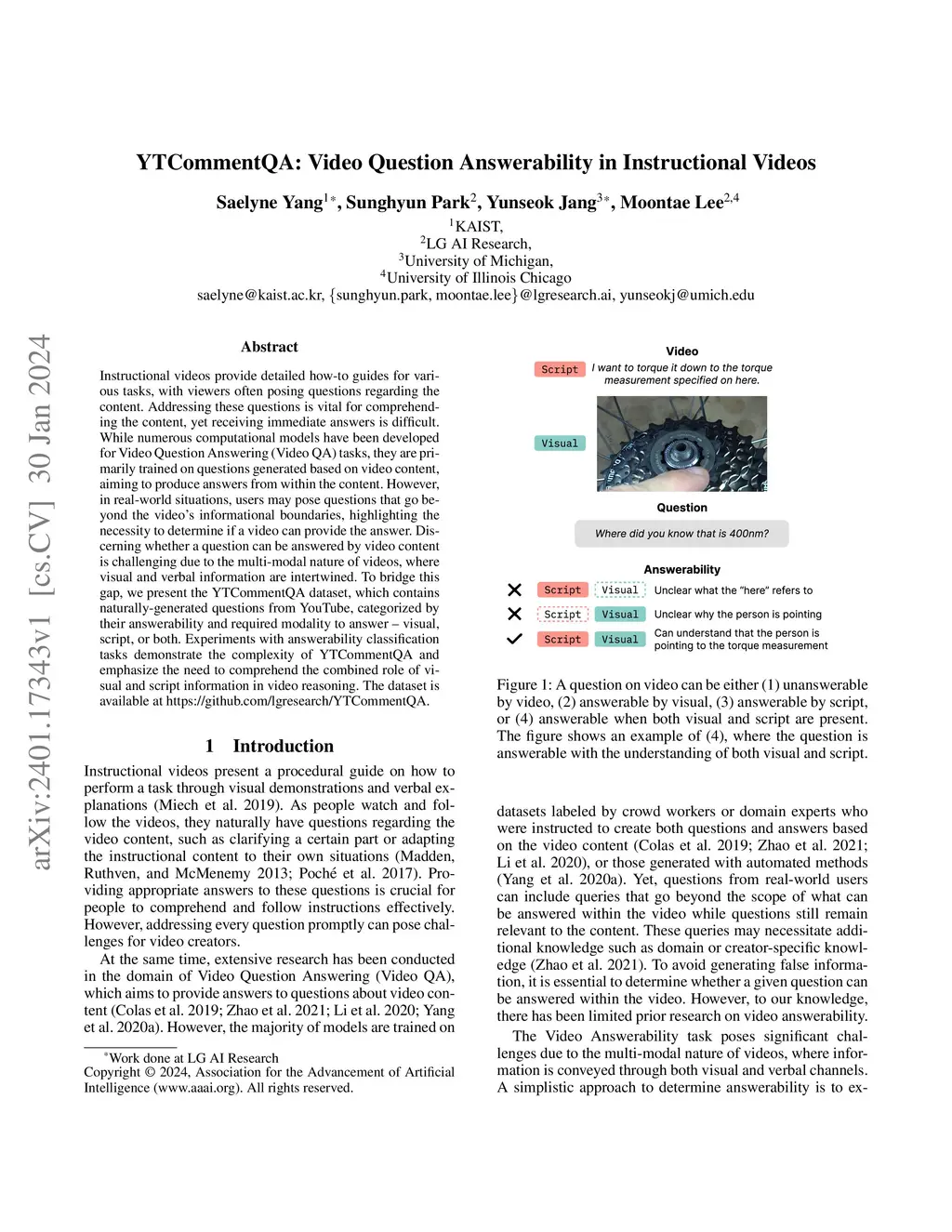 Instructional videos provide detailed how-to guides for various tasks, with viewers often posing questions regarding the content. Addressing these questions is vital for comprehending the content, yet receiving immediate answers is difficult. While numerous computational models have been developed for Video Question Answering (Video QA) tasks, they are primarily trained on questions generated based on video content, aiming to produce answers from within the content. However, in real-world situations, users may pose questions that go beyond the video's informational boundaries, highlighting the necessity to determine if a video can provide the answer. Discerning whether a question can be answered by video content is challenging due to the multi-modal nature of videos, where visual and verbal information are intertwined. To bridge this gap, we present the YTCommentQA dataset, which contains naturally-generated questions from YouTube, categorized by their answerability and required modality to answer -- visual, script, or both. Experiments with answerability classification tasks demonstrate the complexity of YTCommentQA and emphasize the need to comprehend the combined role of visual and script information in video reasoning. The dataset is available at https://github.com/lgresearch/YTCommentQA.