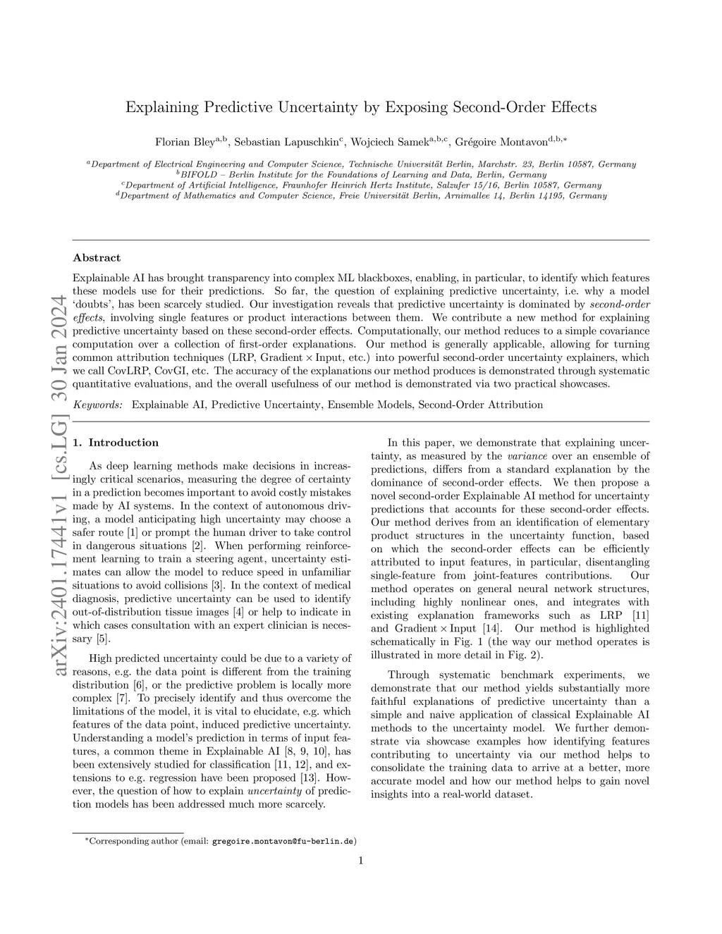 Explainable AI has brought transparency into complex ML blackboxes, enabling, in particular, to identify which features these models use for their predictions. So far, the question of explaining predictive uncertainty, i.e. why a model 'doubts', has been scarcely studied. Our investigation reveals that predictive uncertainty is dominated by second-order effects, involving single features or product interactions between them. We contribute a new method for explaining predictive uncertainty based on these second-order effects. Computationally, our method reduces to a simple covariance computation over a collection of first-order explanations. Our method is generally applicable, allowing for turning common attribution techniques (LRP, Gradient x Input, etc.) into powerful second-order uncertainty explainers, which we call CovLRP, CovGI, etc. The accuracy of the explanations our method produces is demonstrated through systematic quantitative evaluations, and the overall usefulness of our method is demonstrated via two practical showcases.