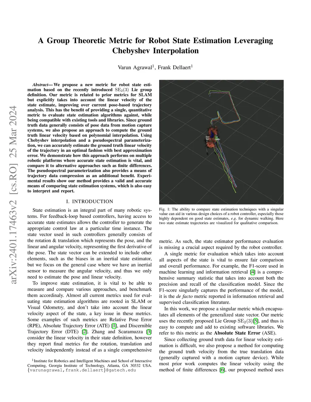 We propose a new metric for robot state estimation based on the recently introduced Lie group definition. Our metric is related to prior metrics for SLAM but explicitly takes into account the linear velocity of the state estimate, improving over current pose-based trajectory analysis. This has the benefit of providing a single, quantitative metric to evaluate state estimation algorithms against, while being compatible with existing tools and libraries. Since ground truth data generally consists of pose data from motion capture systems, we also propose an approach to compute the ground truth linear velocity based on polynomial interpolation. Using Chebyshev interpolation and a pseudospectral parameterization, we can accurately estimate the ground truth linear velocity of the trajectory in an optimal fashion with best approximation error. We demonstrate how this approach performs on multiple robotic platforms where accurate state estimation is vital, and compare it to alternative approaches such as finite differences. The pseudospectral parameterization also provides a means of trajectory data compression as an additional benefit. Experimental results show our method provides a valid and accurate means of comparing state estimation systems, which is also easy to interpret and report.