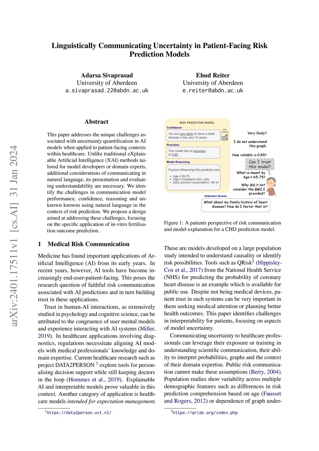 This paper addresses the unique challenges associated with uncertainty quantification in AI models when applied to patient-facing contexts within healthcare. Unlike traditional eXplainable Artificial Intelligence (XAI) methods tailored for model developers or domain experts, additional considerations of communicating in natural language, its presentation and evaluating understandability are necessary. We identify the challenges in communication model performance, confidence, reasoning and unknown knowns using natural language in the context of risk prediction. We propose a design aimed at addressing these challenges, focusing on the specific application of in-vitro fertilisation outcome prediction.