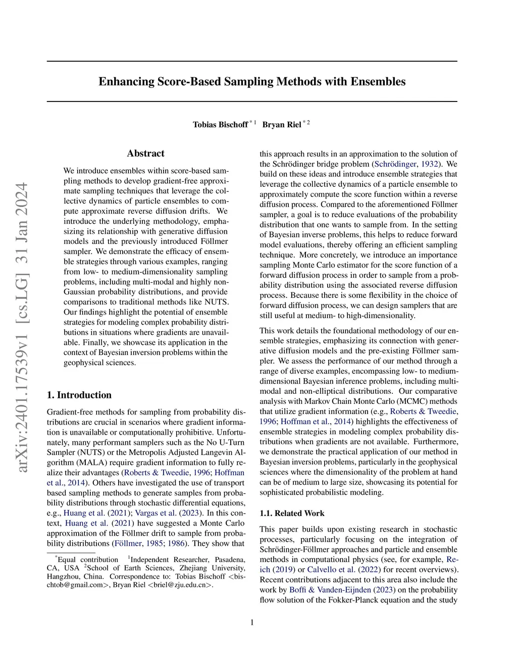 Recent developments in generative modeling have utilized score-based methods coupled with stochastic differential equations to sample from complex probability distributions. However, these and other performant sampling methods generally require gradients of the target probability distribution, which can be unavailable or computationally prohibitive in many scientific and engineering applications. Here, we introduce ensembles within score-based sampling methods to develop gradient-free approximate sampling techniques that leverage the collective dynamics of particle ensembles to compute approximate reverse diffusion drifts. We introduce the underlying methodology, emphasizing its relationship with generative diffusion models and the previously introduced Föllmer sampler. We demonstrate the efficacy of the ensemble strategies through various examples, ranging from low- to medium-dimensionality sampling problems, including multi-modal and highly non-Gaussian probability distributions, and provide comparisons to traditional methods like the No-U-Turn Sampler. Additionally, we showcase these strategies in the context of a high-dimensional Bayesian inversion problem within the geophysical sciences. Our findings highlight the potential of ensemble strategies for modeling complex probability distributions in situations where gradients are unavailable.