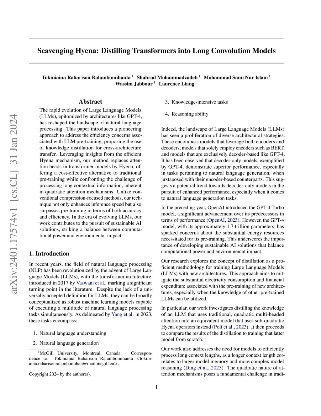 The rapid evolution of Large Language Models (LLMs), epitomized by architectures like GPT-4, has reshaped the landscape of natural language processing. This paper introduces a pioneering approach to address the efficiency concerns associated with LLM pre-training, proposing the use of knowledge distillation for cross-architecture transfer. Leveraging insights from the efficient Hyena mechanism, our method replaces attention heads in transformer models by Hyena, offering a cost-effective alternative to traditional pre-training while confronting the challenge of processing long contextual information, inherent in quadratic attention mechanisms. Unlike conventional compression-focused methods, our technique not only enhances inference speed but also surpasses pre-training in terms of both accuracy and efficiency. In the era of evolving LLMs, our work contributes to the pursuit of sustainable AI solutions, striking a balance between computational power and environmental impact.
