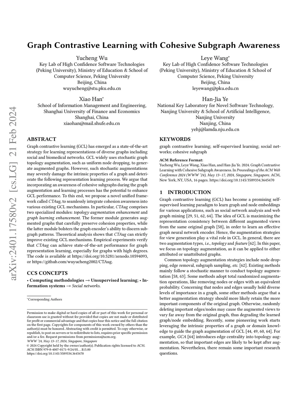 Graph contrastive learning (GCL) has emerged as a state-of-the-art strategy for learning representations of diverse graphs including social and biomedical networks. GCL widely uses stochastic graph topology augmentation, such as uniform node dropping, to generate augmented graphs. However, such stochastic augmentations may severely damage the intrinsic properties of a graph and deteriorate the following representation learning process. We argue that incorporating an awareness of cohesive subgraphs during the graph augmentation and learning processes has the potential to enhance GCL performance. To this end, we propose a novel unified framework called CTAug, to seamlessly integrate cohesion awareness into various existing GCL mechanisms. In particular, CTAug comprises two specialized modules: topology augmentation enhancement and graph learning enhancement. The former module generates augmented graphs that carefully preserve cohesion properties, while the latter module bolsters the graph encoder's ability to discern subgraph patterns. Theoretical analysis shows that CTAug can strictly improve existing GCL mechanisms. Empirical experiments verify that CTAug can achieve state-of-the-art performance for graph representation learning, especially for graphs with high degrees. The code is available at https://doi.org/10.5281/zenodo.10594093, or https://github.com/wuyucheng2002/CTAug.
