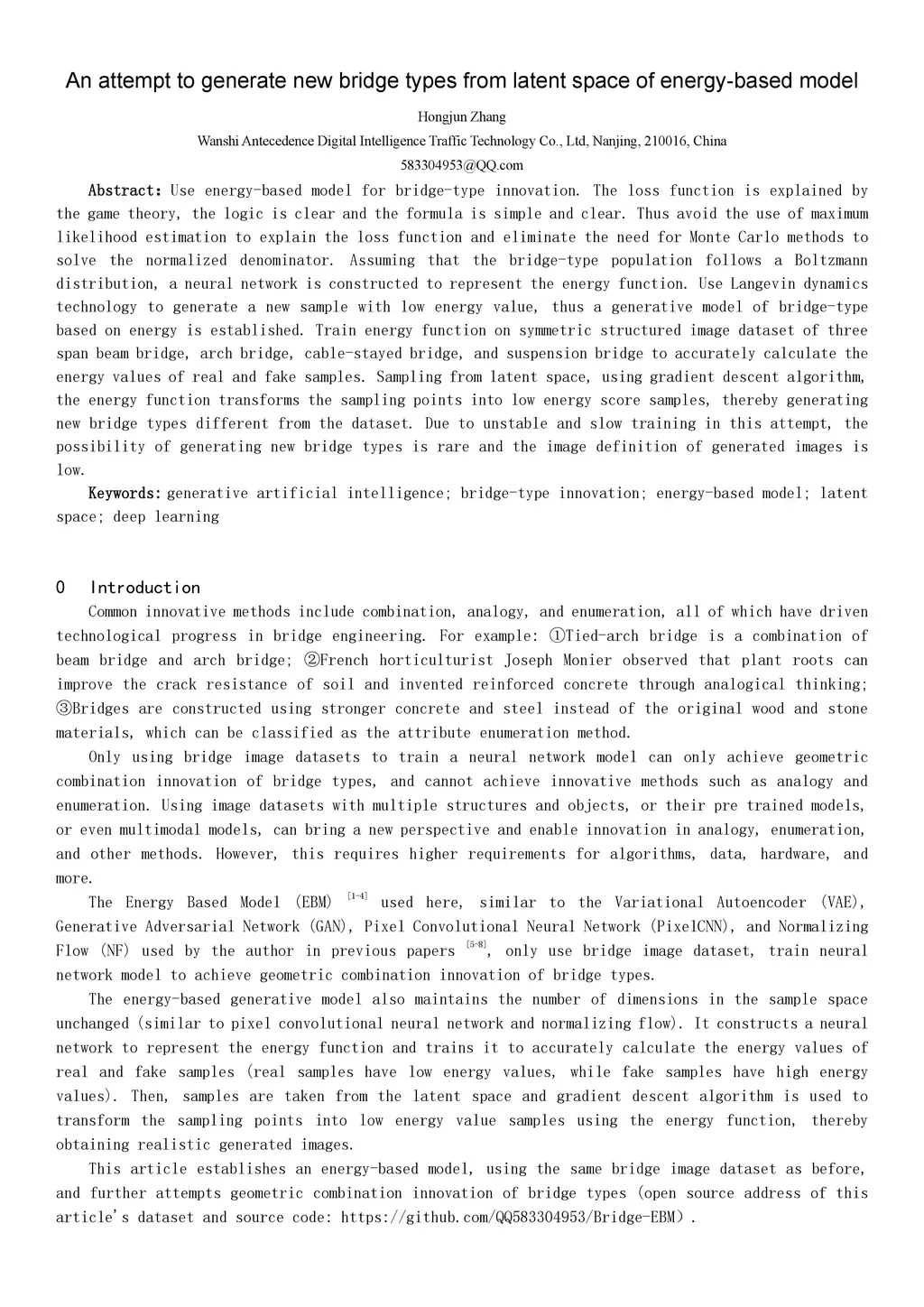 Use energy-based model for bridge-type innovation. The loss function is explained by the game theory, the logic is clear and the formula is simple and clear. Thus avoid the use of maximum likelihood estimation to explain the loss function and eliminate the need for Monte Carlo methods to solve the normalized denominator. Assuming that the bridge-type population follows a Boltzmann distribution, a neural network is constructed to represent the energy function. Use Langevin dynamics technology to generate a new sample with low energy value, thus a generative model of bridge-type based on energy is established. Train energy function on symmetric structured image dataset of three span beam bridge, arch bridge, cable-stayed bridge, and suspension bridge to accurately calculate the energy values of real and fake samples. Sampling from latent space, using gradient descent algorithm, the energy function transforms the sampling points into low energy score samples, thereby generating new bridge types different from the dataset. Due to unstable and slow training in this attempt, the possibility of generating new bridge types is rare and the image definition of generated images is low.