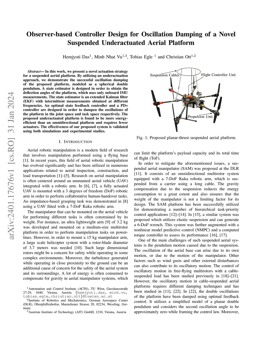 In this work, we present a novel actuation strategy for a suspended aerial platform. By utilizing an underactuation approach, we demonstrate the successful oscillation damping of the proposed platform, modeled as a spherical double pendulum. A state estimator is designed in order to obtain the deflection angles of the platform, which uses only onboard IMU measurements. The state estimator is an extended Kalman filter (EKF) with intermittent measurements obtained at different frequencies. An optimal state feedback controller and a PD+ controller are designed in order to dampen the oscillations of the platform in the joint space and task space respectively. The proposed underactuated platform is found to be more energy-efficient than an omnidirectional platform and requires fewer actuators. The effectiveness of our proposed system is validated using both simulations and experimental studies.