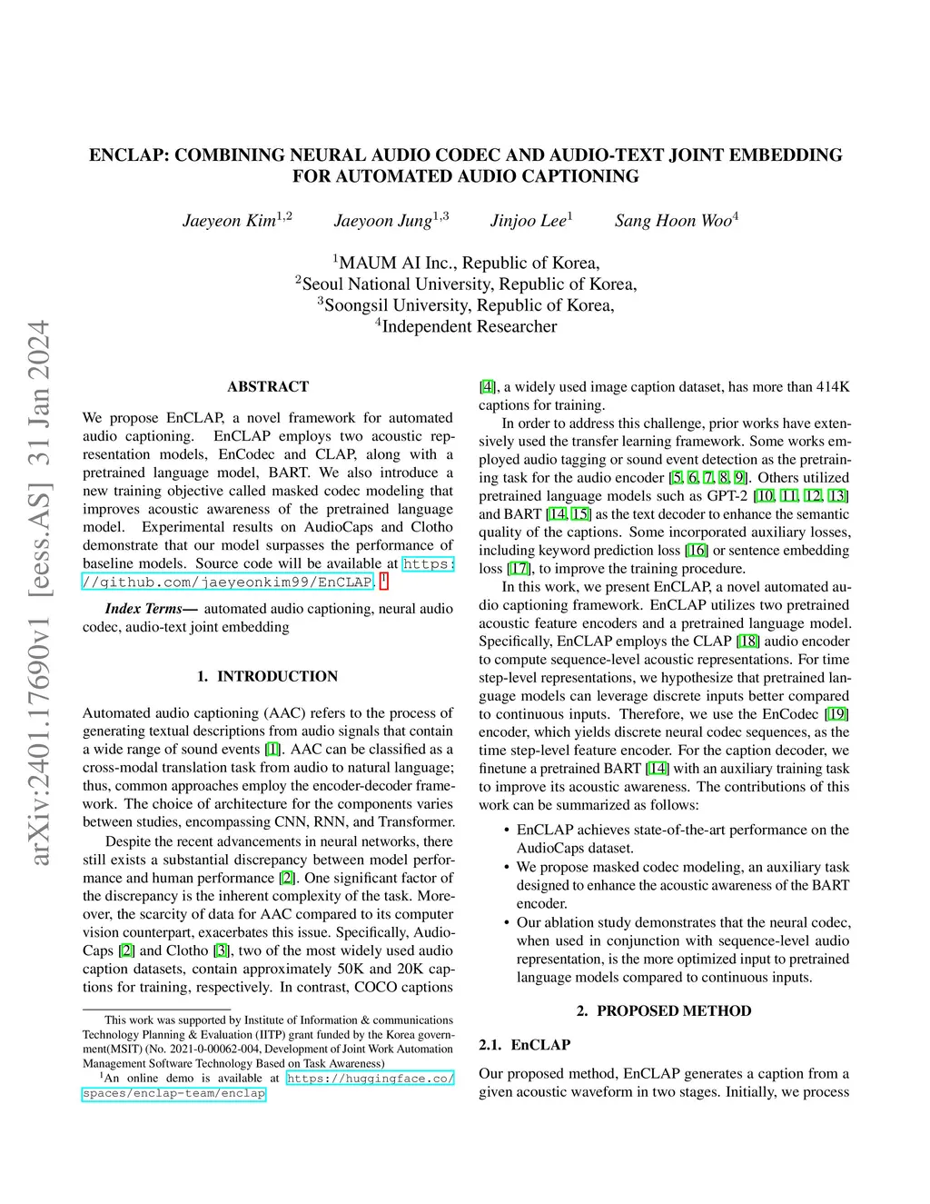 We propose EnCLAP, a novel framework for automated audio captioning. EnCLAP employs two acoustic representation models, EnCodec and CLAP, along with a pretrained language model, BART. We also introduce a new training objective called masked codec modeling that improves acoustic awareness of the pretrained language model. Experimental results on AudioCaps and Clotho demonstrate that our model surpasses the performance of baseline models. Source code will be available at https://github.com/jaeyeonkim99/EnCLAP . An online demo is available at https://huggingface.co/spaces/enclap-team/enclap .