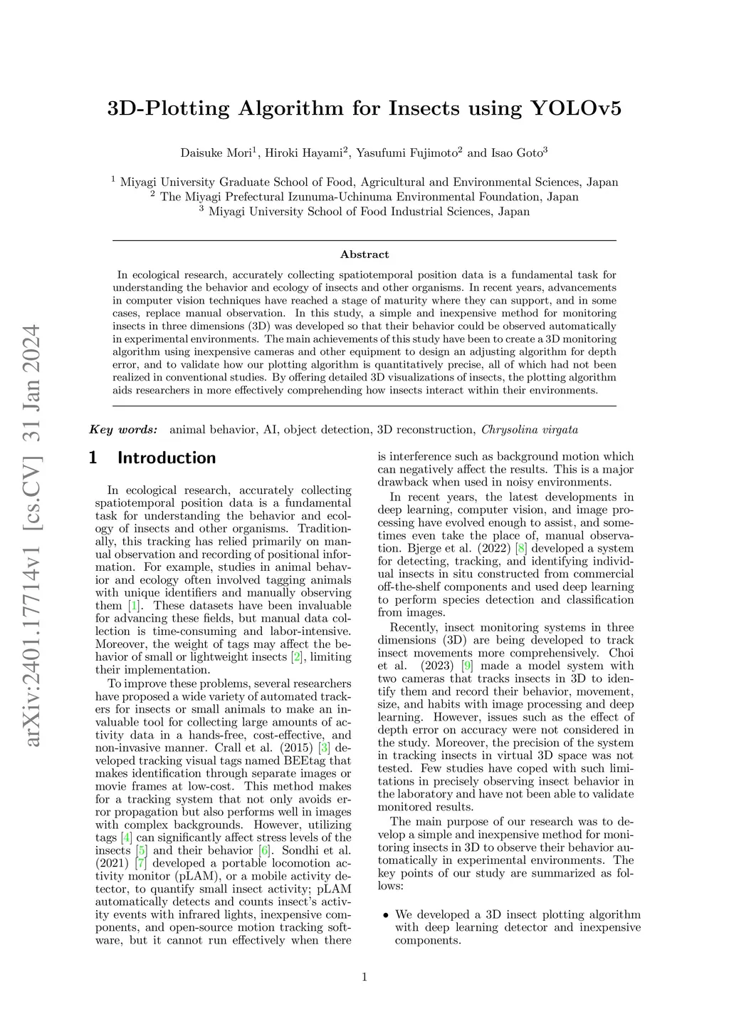 In ecological research, accurately collecting spatiotemporal position data is a fundamental task for understanding the behavior and ecology of insects and other organisms. In recent years, advancements in computer vision techniques have reached a stage of maturity where they can support, and in some cases, replace manual observation. In this study, a simple and inexpensive method for monitoring insects in three dimensions (3D) was developed so that their behavior could be observed automatically in experimental environments. The main achievements of this study have been to create a 3D monitoring algorithm using inexpensive cameras and other equipment to design an adjusting algorithm for depth error, and to validate how our plotting algorithm is quantitatively precise, all of which had not been realized in conventional studies. By offering detailed 3D visualizations of insects, the plotting algorithm aids researchers in more effectively comprehending how insects interact within their environments.