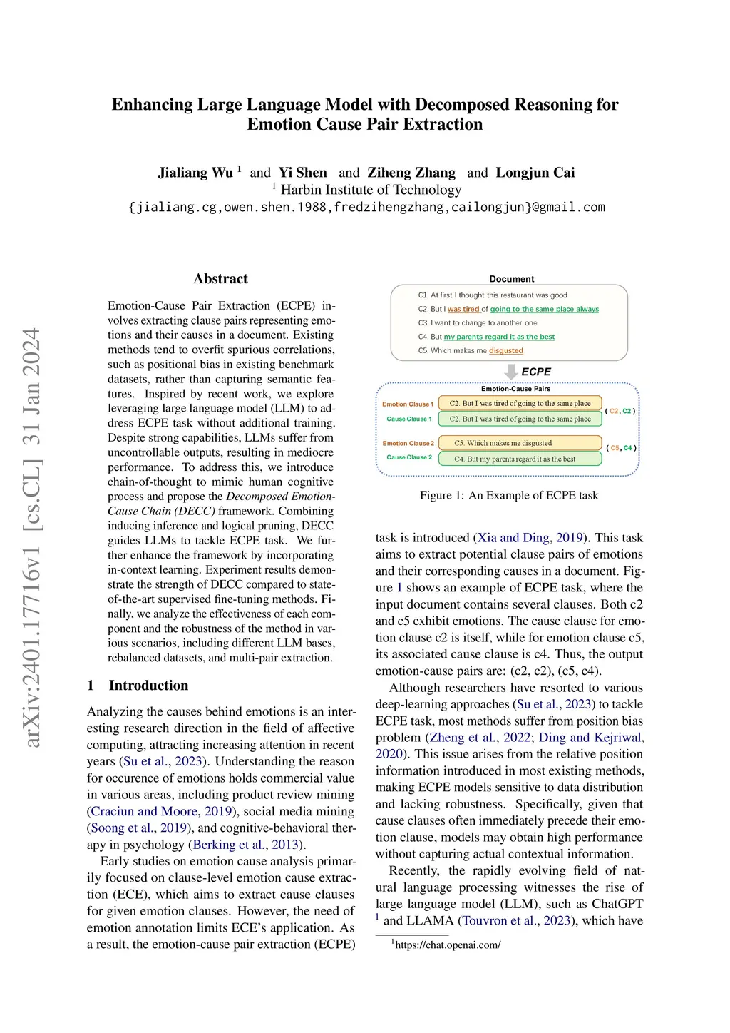 Emotion-Cause Pair Extraction (ECPE) involves extracting clause pairs representing emotions and their causes in a document. Existing methods tend to overfit spurious correlations, such as positional bias in existing benchmark datasets, rather than capturing semantic features. Inspired by recent work, we explore leveraging large language model (LLM) to address ECPE task without additional training. Despite strong capabilities, LLMs suffer from uncontrollable outputs, resulting in mediocre performance. To address this, we introduce chain-of-thought to mimic human cognitive process and propose the Decomposed Emotion-Cause Chain (DECC) framework. Combining inducing inference and logical pruning, DECC guides LLMs to tackle ECPE task. We further enhance the framework by incorporating in-context learning. Experiment results demonstrate the strength of DECC compared to state-of-the-art supervised fine-tuning methods. Finally, we analyze the effectiveness of each component and the robustness of the method in various scenarios, including different LLM bases, rebalanced datasets, and multi-pair extraction.