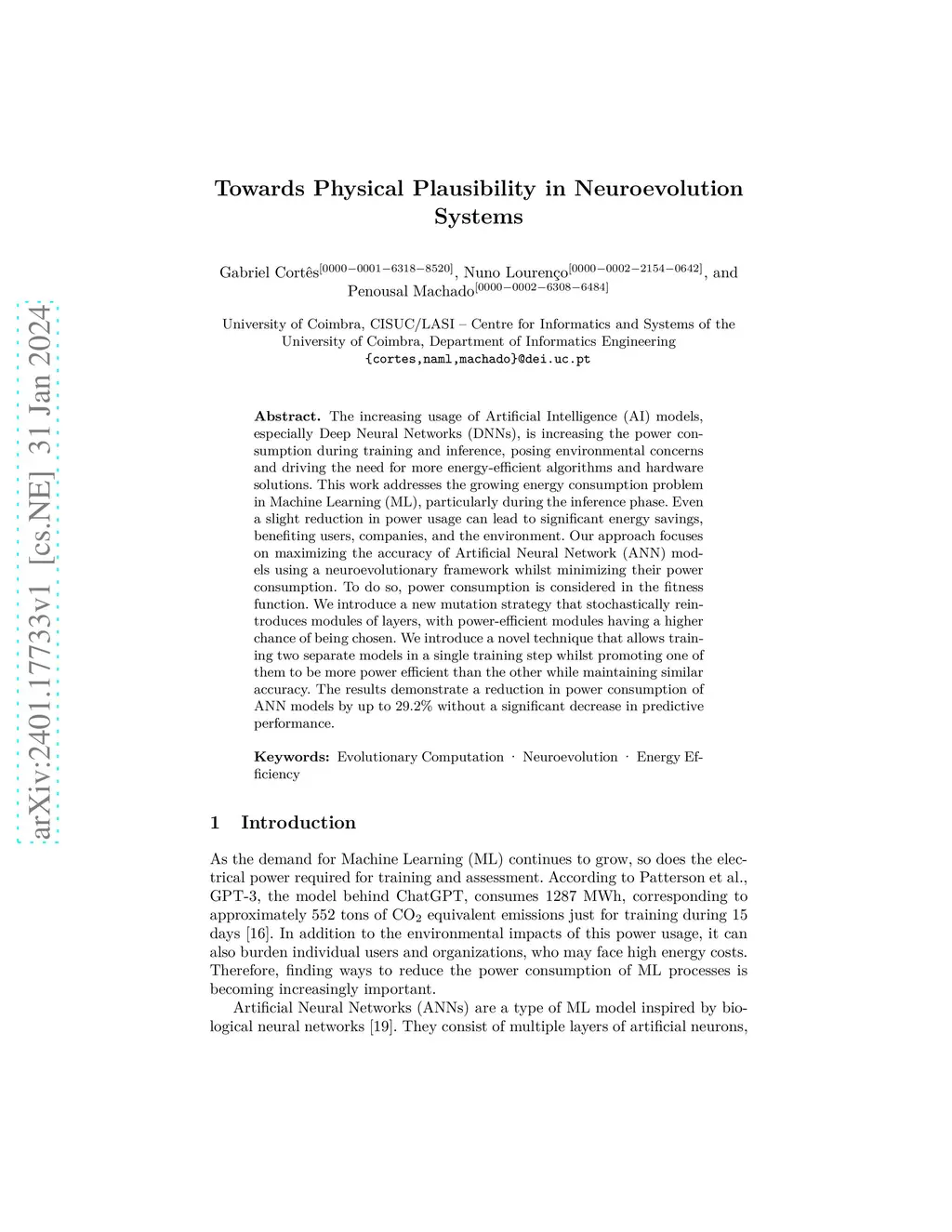 Towards Physical Plausibility in Neuroevolution Systems