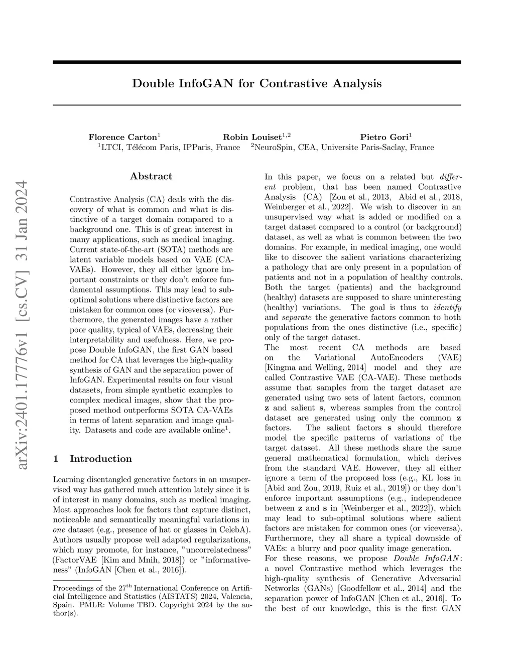 Contrastive Analysis (CA) deals with the discovery of what is common and what is distinctive of a target domain compared to a background one. This is of great interest in many applications, such as medical imaging. Current state-of-the-art (SOTA) methods are latent variable models based on VAE (CA-VAEs). However, they all either ignore important constraints or they don't enforce fundamental assumptions. This may lead to sub-optimal solutions where distinctive factors are mistaken for common ones (or viceversa). Furthermore, the generated images have a rather poor quality, typical of VAEs, decreasing their interpretability and usefulness. Here, we propose Double InfoGAN, the first GAN based method for CA that leverages the high-quality synthesis of GAN and the separation power of InfoGAN. Experimental results on four visual datasets, from simple synthetic examples to complex medical images, show that the proposed method outperforms SOTA CA-VAEs in terms of latent separation and image quality. Datasets and code are available online.