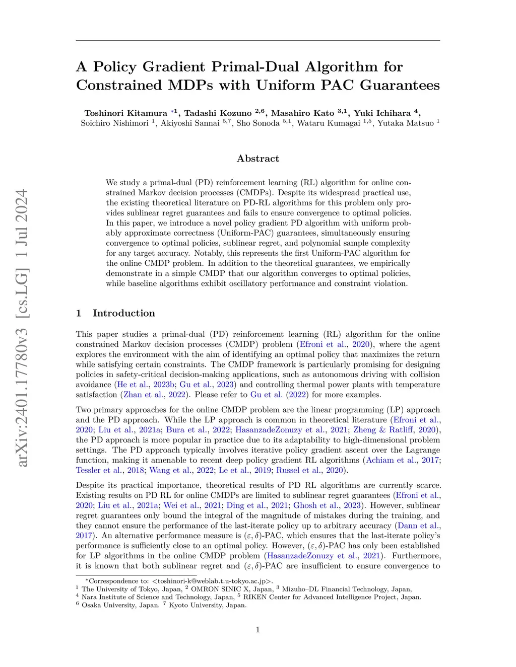 We study a primal-dual (PD) reinforcement learning (RL) algorithm for online constrained Markov decision processes (CMDPs). Despite its widespread practical use, the existing theoretical literature on PD-RL algorithms for this problem only provides sublinear regret guarantees and fails to ensure convergence to optimal policies. In this paper, we introduce a novel policy gradient PD algorithm with uniform probably approximate correctness (Uniform-PAC) guarantees, simultaneously ensuring convergence to optimal policies, sublinear regret, and polynomial sample complexity for any target accuracy. Notably, this represents the first Uniform-PAC algorithm for the online CMDP problem. In addition to the theoretical guarantees, we empirically demonstrate in a simple CMDP that our algorithm converges to optimal policies, while baseline algorithms exhibit oscillatory performance and constraint violation.
