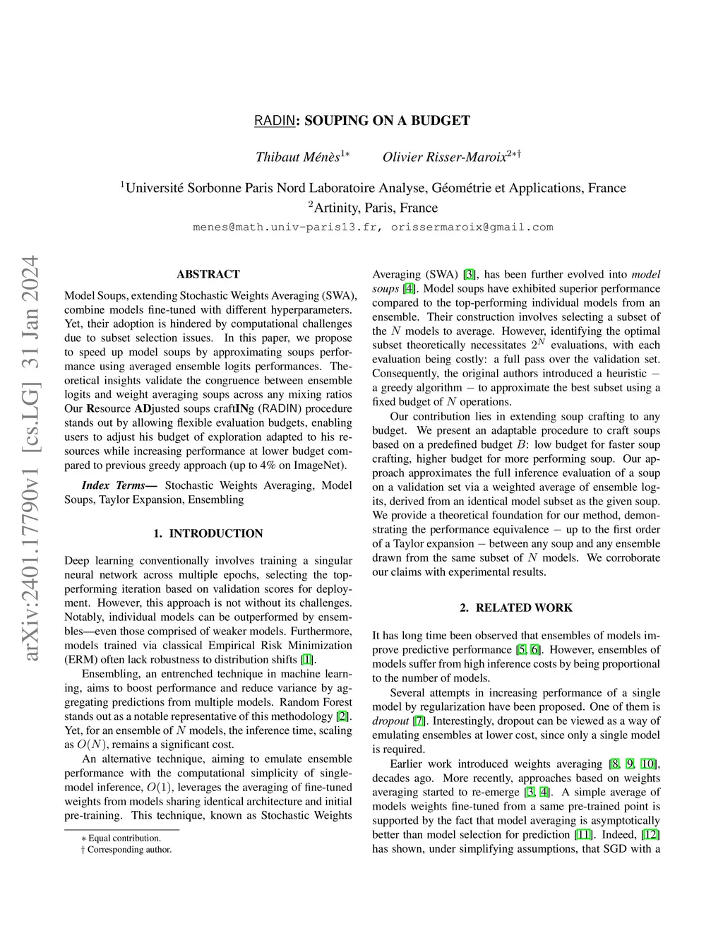Model Soups, extending Stochastic Weights Averaging (SWA), combine models fine-tuned with different hyperparameters. Yet, their adoption is hindered by computational challenges due to subset selection issues. In this paper, we propose to speed up model soups by approximating soups performance using averaged ensemble logits performances. Theoretical insights validate the congruence between ensemble logits and weight averaging soups across any mixing ratios. Our Resource ADjusted soups craftINg (RADIN) procedure stands out by allowing flexible evaluation budgets, enabling users to adjust his budget of exploration adapted to his resources while increasing performance at lower budget compared to previous greedy approach (up to 4% on ImageNet).