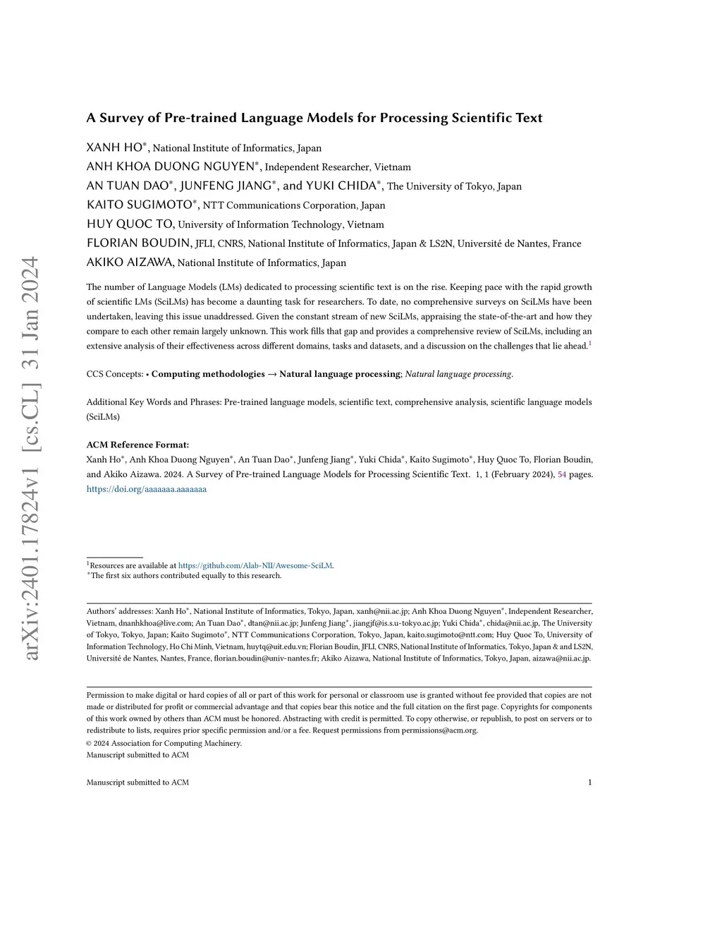 A Survey of Pre-trained Language Models for Processing Scientific Text