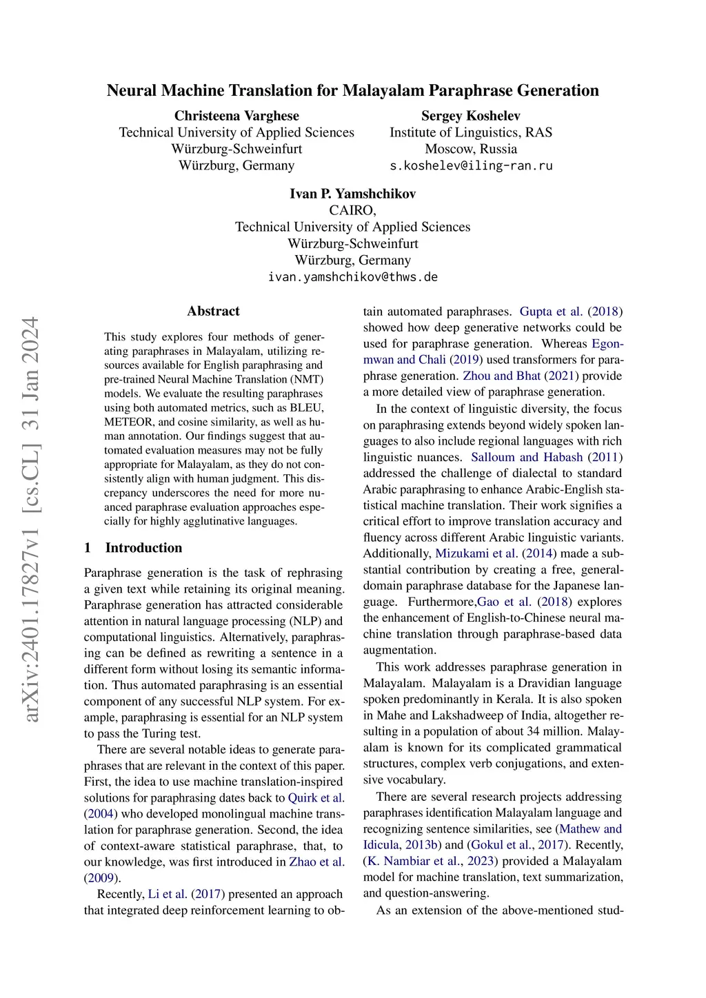 This study explores four methods of generating paraphrases in Malayalam, utilizing resources available for English paraphrasing and pre-trained Neural Machine Translation (NMT) models. We evaluate the resulting paraphrases using both automated metrics, such as BLEU, METEOR, and cosine similarity, as well as human annotation. Our findings suggest that automated evaluation measures may not be fully appropriate for Malayalam, as they do not consistently align with human judgment. This discrepancy underscores the need for more nuanced paraphrase evaluation approaches especially for highly agglutinative languages.