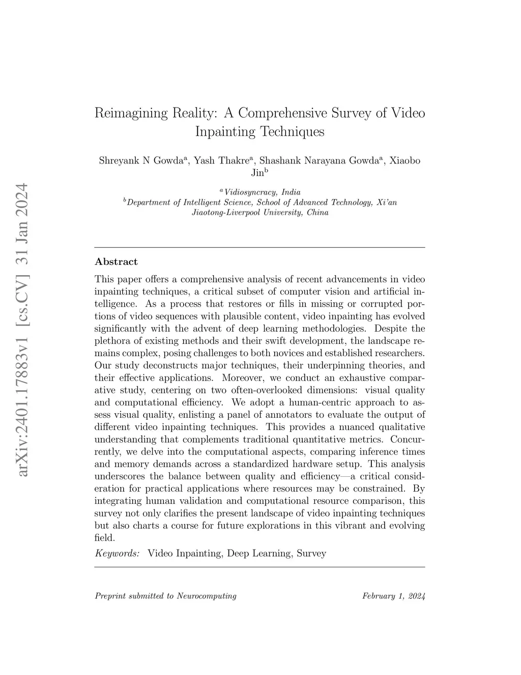 This paper offers a comprehensive analysis of recent advancements in video inpainting techniques, a critical subset of computer vision and artificial intelligence. As a process that restores or fills in missing or corrupted portions of video sequences with plausible content, video inpainting has evolved significantly with the advent of deep learning methodologies. Despite the plethora of existing methods and their swift development, the landscape remains complex, posing challenges to both novices and established researchers. Our study deconstructs major techniques, their underpinning theories, and their effective applications. Moreover, we conduct an exhaustive comparative study, centering on two often-overlooked dimensions: visual quality and computational efficiency. We adopt a human-centric approach to assess visual quality, enlisting a panel of annotators to evaluate the output of different video inpainting techniques. This provides a nuanced qualitative understanding that complements traditional quantitative metrics. Concurrently, we delve into the computational aspects, comparing inference times and memory demands across a standardized hardware setup. This analysis underscores the balance between quality and efficiency: a critical consideration for practical applications where resources may be constrained. By integrating human validation and computational resource comparison, this survey not only clarifies the present landscape of video inpainting techniques but also charts a course for future explorations in this vibrant and evolving field.