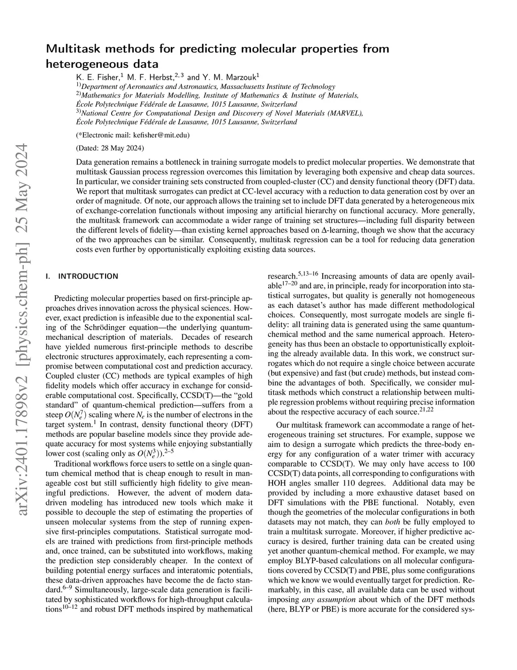Data generation remains a bottleneck in training surrogate models to predict molecular properties. We demonstrate that multitask Gaussian process regression overcomes this limitation by leveraging both expensive and cheap data sources. In particular, we consider training sets constructed from coupled-cluster (CC) and density functional theory (DFT) data. We report that multitask surrogates can predict at CC-level accuracy with a reduction to data generation cost by over an order of magnitude. Of note, our approach allows the training set to include DFT data generated by a heterogeneous mix of exchange-correlation functionals without imposing any artificial hierarchy on functional accuracy. More generally, the multitask framework can accommodate a wider range of training set structures -- including full disparity between the different levels of fidelity -- than existing kernel approaches based on -learning, though we show that the accuracy of the two approaches can be similar. Consequently, multitask regression can be a tool for reducing data generation costs even further by opportunistically exploiting existing data sources.