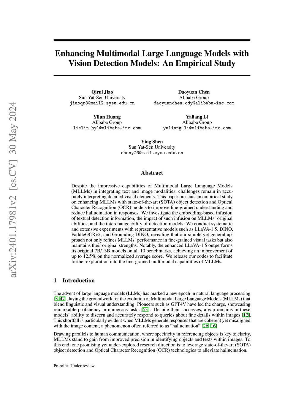Despite the impressive capabilities of Multimodal Large Language Models (MLLMs) in integrating text and image modalities, challenges remain in accurately interpreting detailed visual elements. This paper presents an empirical study on enhancing MLLMs with state-of-the-art (SOTA) object detection and Optical Character Recognition (OCR) models to improve fine-grained understanding and reduce hallucination in responses. We investigate the embedding-based infusion of textual detection information, the impact of such infusion on MLLMs' original abilities, and the interchangeability of detection models. We conduct systematic and extensive experiments with representative models such as LLaVA-1.5, DINO, PaddleOCRv2, and Grounding DINO, revealing that our simple yet general approach not only refines MLLMs' performance in fine-grained visual tasks but also maintains their original strengths. Notably, the enhanced LLaVA-1.5 outperforms its original 7B/13B models on all 10 benchmarks, achieving an improvement of up to 12.5% on the normalized average score. We release our codes to facilitate further exploration into the fine-grained multimodal capabilities of MLLMs.