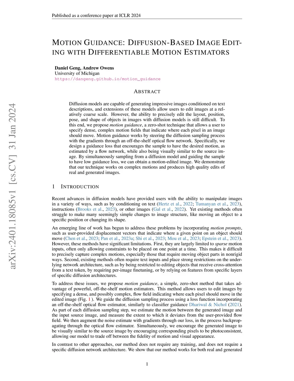 Diffusion models are capable of generating impressive images conditioned on text descriptions, and extensions of these models allow users to edit images at a relatively coarse scale. However, the ability to precisely edit the layout, position, pose, and shape of objects in images with diffusion models is still difficult. To this end, we propose motion guidance, a zero-shot technique that allows a user to specify dense, complex motion fields that indicate where each pixel in an image should move. Motion guidance works by steering the diffusion sampling process with the gradients through an off-the-shelf optical flow network. Specifically, we design a guidance loss that encourages the sample to have the desired motion, as estimated by a flow network, while also being visually similar to the source image. By simultaneously sampling from a diffusion model and guiding the sample to have low guidance loss, we can obtain a motion-edited image. We demonstrate that our technique works on complex motions and produces high quality edits of real and generated images.
