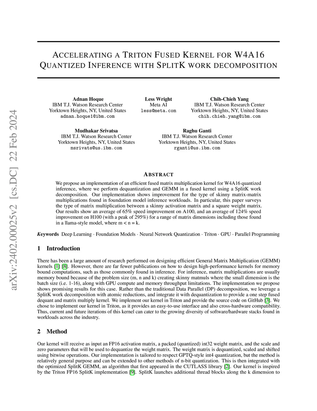 We propose an implementation of an efficient fused matrix multiplication kernel for W4A16 quantized inference, where we perform dequantization and GEMM in a fused kernel using a SplitK work decomposition. Our implementation shows improvement for the type of skinny matrix-matrix multiplications found in foundation model inference workloads. In particular, this paper surveys the type of matrix multiplication between a skinny activation matrix and a square weight matrix. Our results show an average of 65% speed improvement on A100, and an average of 124% speed improvement on H100 (with a peak of 295%) for a range of matrix dimensions including those found in a llama-style model, where m < n = k.