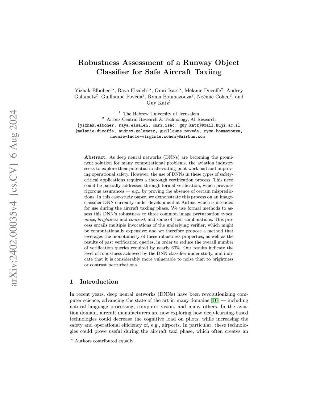 As deep neural networks (DNNs) are becoming the prominent solution for many computational problems, the aviation industry seeks to explore their potential in alleviating pilot workload and in improving operational safety. However, the use of DNNs in this type of safety-critical applications requires a thorough certification process. This need can be addressed through formal verification, which provides rigorous assurances -- e.g.,~by proving the absence of certain mispredictions. In this case-study paper, we demonstrate this process using an image-classifier DNN currently under development at Airbus and intended for use during the aircraft taxiing phase. We use formal methods to assess this DNN's robustness to three common image perturbation types: noise, brightness and contrast, and some of their combinations. This process entails multiple invocations of the underlying verifier, which might be computationally expensive; and we therefore propose a method that leverages the monotonicity of these robustness properties, as well as the results of past verification queries, in order to reduce the overall number of verification queries required by nearly 60%. Our results provide an indication of the level of robustness achieved by the DNN classifier under study, and indicate that it is considerably more vulnerable to noise than to brightness or contrast perturbations.