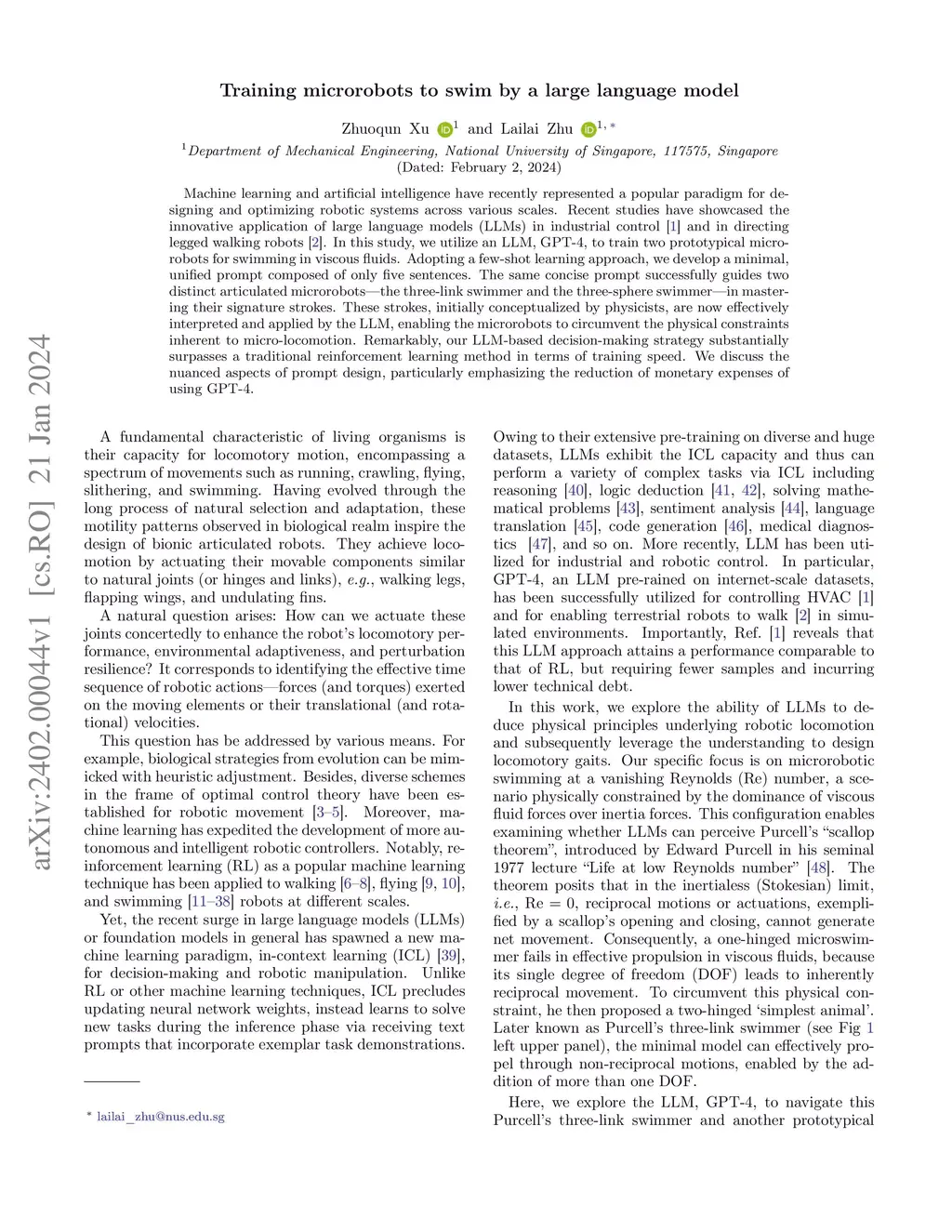 Machine learning and artificial intelligence have recently represented a popular paradigm for designing and optimizing robotic systems across various scales. Recent studies have showcased the innovative application of large language models (LLMs) in industrial control [1] and in directing legged walking robots [2]. In this study, we utilize an LLM, GPT-4, to train two prototypical microrobots for swimming in viscous fluids. Adopting a few-shot learning approach, we develop a minimal, unified prompt composed of only five sentences. The same concise prompt successfully guides two distinct articulated microrobots -- the three-link swimmer and the three-sphere swimmer -- in mastering their signature strokes. These strokes, initially conceptualized by physicists, are now effectively interpreted and applied by the LLM, enabling the microrobots to circumvent the physical constraints inherent to micro-locomotion. Remarkably, our LLM-based decision-making strategy substantially surpasses a traditional reinforcement learning method in terms of training speed. We discuss the nuanced aspects of prompt design, particularly emphasizing the reduction of monetary expenses of using GPT-4.