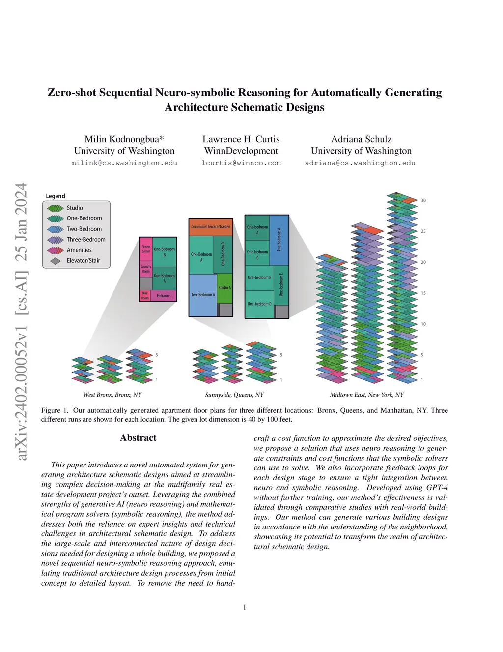 This paper introduces a novel automated system for generating architecture schematic designs aimed at streamlining complex decision-making at the multifamily real estate development project's outset. Leveraging the combined strengths of generative AI (neuro reasoning) and mathematical program solvers (symbolic reasoning), the method addresses both the reliance on expert insights and technical challenges in architectural schematic design. To address the large-scale and interconnected nature of design decisions needed for designing a whole building, we proposed a novel sequential neuro-symbolic reasoning approach, emulating traditional architecture design processes from initial concept to detailed layout. To remove the need to hand-craft a cost function to approximate the desired objectives, we propose a solution that uses neuro reasoning to generate constraints and cost functions that the symbolic solvers can use to solve. We also incorporate feedback loops for each design stage to ensure a tight integration between neuro and symbolic reasoning. Developed using GPT-4 without further training, our method's effectiveness is validated through comparative studies with real-world buildings. Our method can generate various building designs in accordance with the understanding of the neighborhood, showcasing its potential to transform the realm of architectural schematic design.