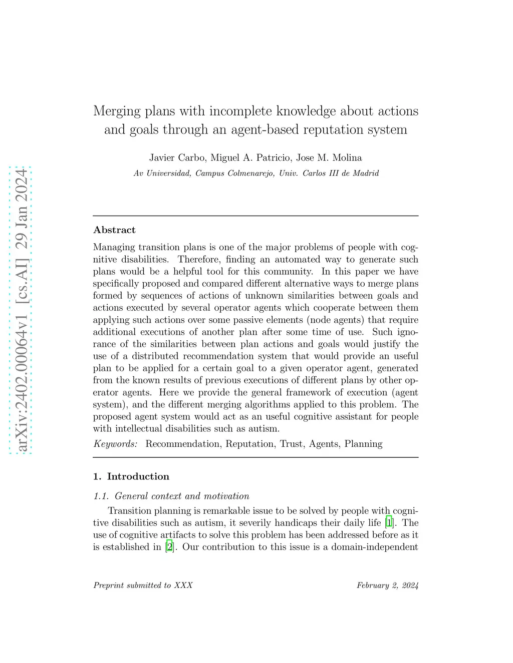 Managing transition plans is one of the major problems of people with cognitive disabilities. Therefore, finding an automated way to generate such plans would be a helpful tool for this community. In this paper we have specifically proposed and compared different alternative ways to merge plans formed by sequences of actions of unknown similarities between goals and actions executed by several operator agents which cooperate between them applying such actions over some passive elements (node agents) that require additional executions of another plan after some time of use. Such ignorance of the similarities between plan actions and goals would justify the use of a distributed recommendation system that would provide an useful plan to be applied for a certain goal to a given operator agent, generated from the known results of previous executions of different plans by other operator agents. Here we provide the general framework of execution (agent system), and the different merging algorithms applied to this problem. The proposed agent system would act as an useful cognitive assistant for people with intelectual disabilities such as autism.