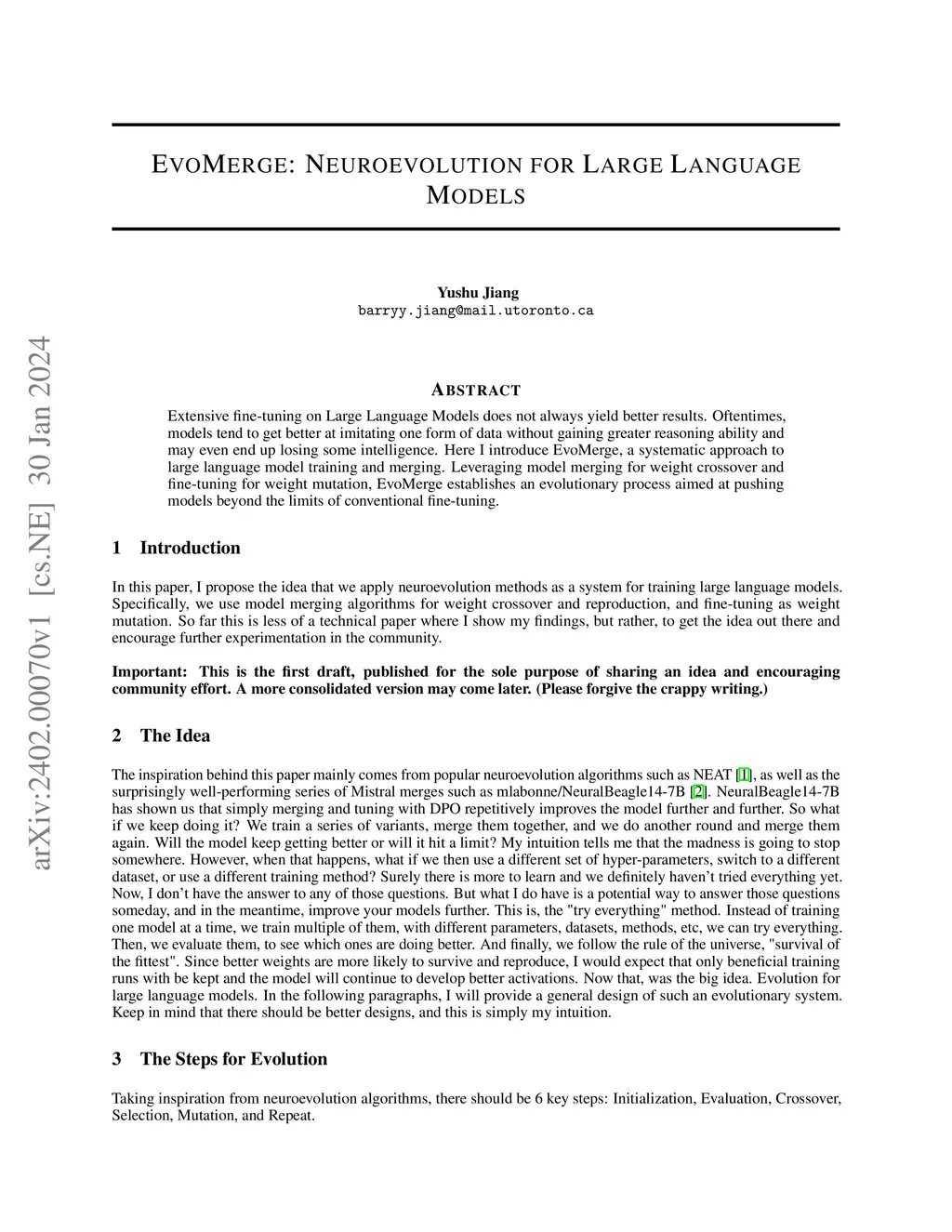 Extensive fine-tuning on Large Language Models does not always yield better results. Oftentimes, models tend to get better at imitating one form of data without gaining greater reasoning ability and may even end up losing some intelligence. Here I introduce EvoMerge, a systematic approach to large language model training and merging. Leveraging model merging for weight crossover and fine-tuning for weight mutation, EvoMerge establishes an evolutionary process aimed at pushing models beyond the limits of conventional fine-tuning.