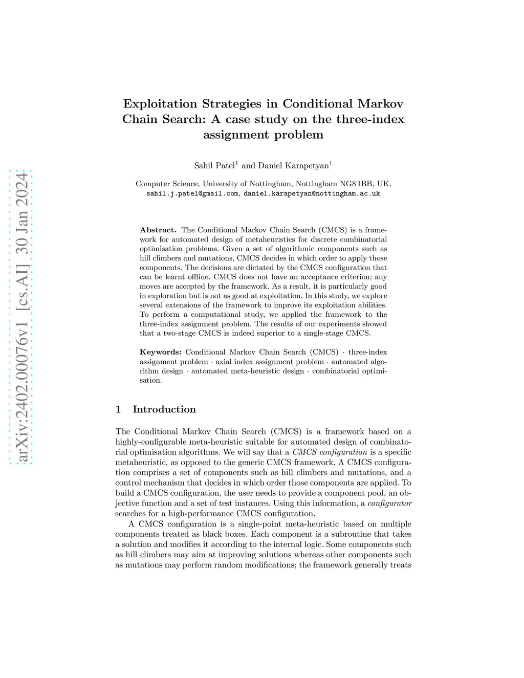 The Conditional Markov Chain Search (CMCS) is a framework for automated design of metaheuristics for discrete combinatorial optimisation problems. Given a set of algorithmic components such as hill climbers and mutations, CMCS decides in which order to apply those components. The decisions are dictated by the CMCS configuration that can be learnt offline. CMCS does not have an acceptance criterion; any moves are accepted by the framework. As a result, it is particularly good in exploration but is not as good at exploitation. In this study, we explore several extensions of the framework to improve its exploitation abilities. To perform a computational study, we applied the framework to the three-index assignment problem. The results of our experiments showed that a two-stage CMCS is indeed superior to a single-stage CMCS.