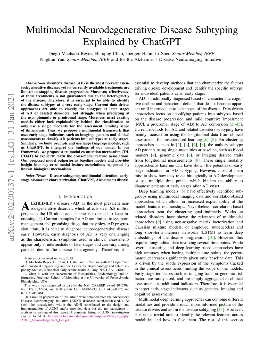 Alzheimer's disease (AD) is the most prevalent neurodegenerative disease; yet its currently available treatments are limited to stopping disease progression. Moreover, effectiveness of these treatments is not guaranteed due to the heterogenetiy of the disease. Therefore, it is essential to be able to identify the disease subtypes at a very early stage. Current data driven approaches are able to classify the subtypes at later stages of AD or related disorders, but struggle when predicting at the asymptomatic or prodromal stage. Moreover, most existing models either lack explainability behind the classification or only use a single modality for the assessment, limiting scope of its analysis. Thus, we propose a multimodal framework that uses early-stage indicators such as imaging, genetics and clinical assessments to classify AD patients into subtypes at early stages. Similarly, we build prompts and use large language models, such as ChatGPT, to interpret the findings of our model. In our framework, we propose a tri-modal co-attention mechanism (Tri-COAT) to explicitly learn the cross-modal feature associations. Our proposed model outperforms baseline models and provides insight into key cross-modal feature associations supported by known biological mechanisms.