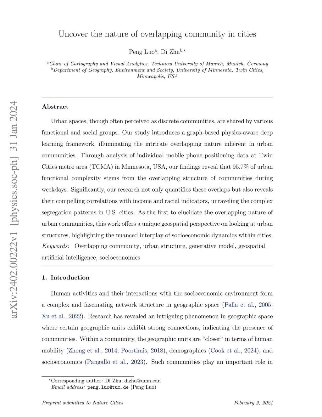 Urban spaces, though often perceived as discrete communities, are shared by various functional and social groups. Our study introduces a graph-based physics-aware deep learning framework, illuminating the intricate overlapping nature inherent in urban communities. Through analysis of individual mobile phone positioning data at Twin Cities metro area (TCMA) in Minnesota, USA, our findings reveal that 95.7 % of urban functional complexity stems from the overlapping structure of communities during weekdays. Significantly, our research not only quantifies these overlaps but also reveals their compelling correlations with income and racial indicators, unraveling the complex segregation patterns in U.S. cities. As the first to elucidate the overlapping nature of urban communities, this work offers a unique geospatial perspective on looking at urban structures, highlighting the nuanced interplay of socioeconomic dynamics within cities.