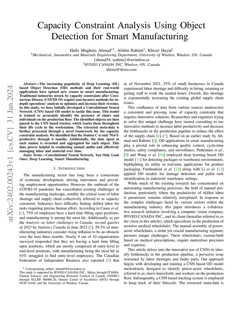 The increasing popularity of Deep Learning (DL) based Object Detection (OD) methods and their real-world applications have opened new venues in smart manufacturing. Traditional industries struck by capacity constraints after Coronavirus Disease (COVID-19) require non-invasive methods for in-depth operations' analysis to optimize and increase their revenue. In this study, we have initially developed a Convolutional Neural Network (CNN) based OD model to tackle this issue. This model is trained to accurately identify the presence of chairs and individuals on the production floor. The identified objects are then passed to the CNN based tracker, which tracks them throughout their life cycle in the workstation. The extracted meta-data is further processed through a novel framework for the capacity constraint analysis. We identified that the Station C is only 70.6% productive through 6 months. Additionally, the time spent at each station is recorded and aggregated for each object. This data proves helpful in conducting annual audits and effectively managing labor and material over time.
