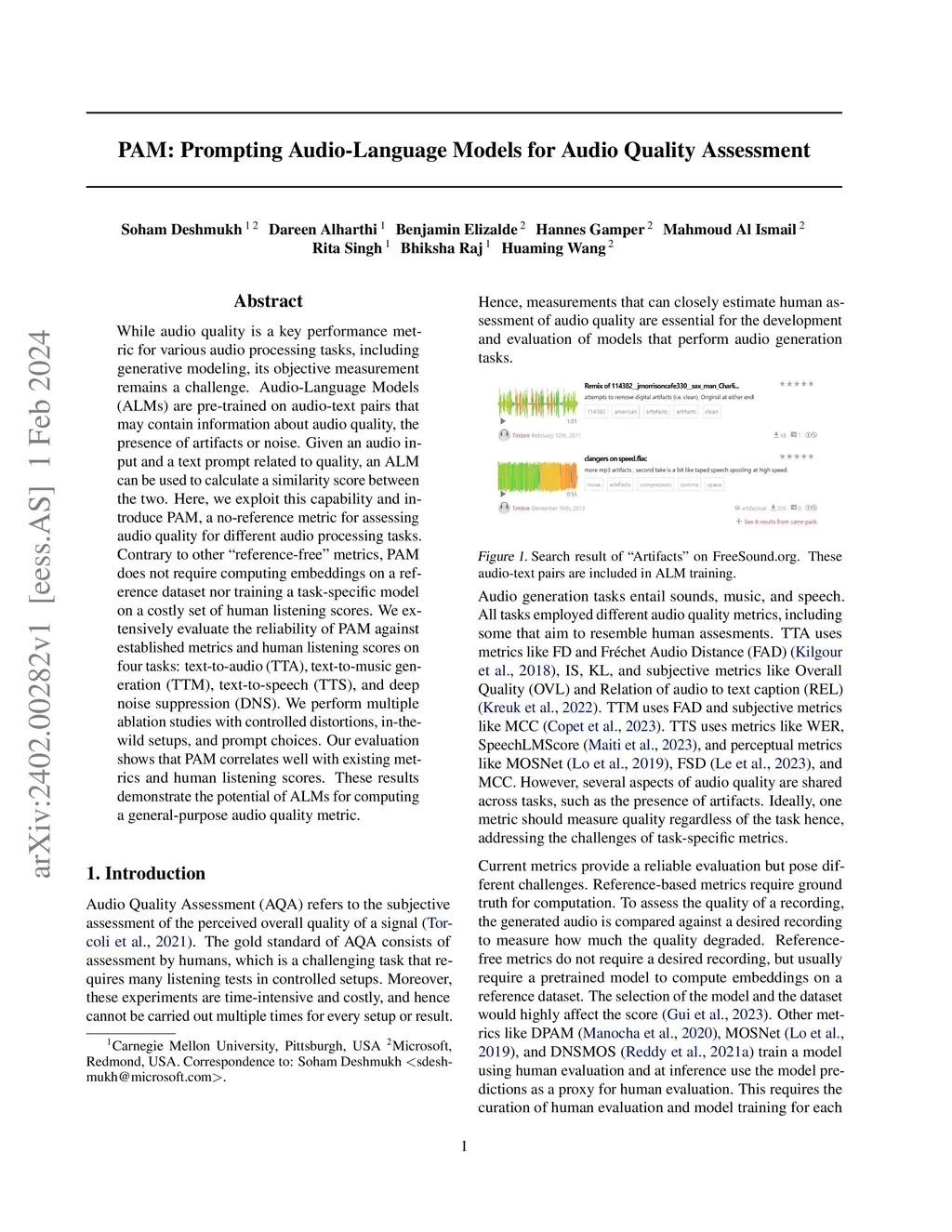 While audio quality is a key performance metric for various audio processing tasks, including generative modeling, its objective measurement remains a challenge. Audio-Language Models (ALMs) are pre-trained on audio-text pairs that may contain information about audio quality, the presence of artifacts, or noise. Given an audio input and a text prompt related to quality, an ALM can be used to calculate a similarity score between the two. Here, we exploit this capability and introduce PAM, a no-reference metric for assessing audio quality for different audio processing tasks. Contrary to other "reference-free" metrics, PAM does not require computing embeddings on a reference dataset nor training a task-specific model on a costly set of human listening scores. We extensively evaluate the reliability of PAM against established metrics and human listening scores on four tasks: text-to-audio (TTA), text-to-music generation (TTM), text-to-speech (TTS), and deep noise suppression (DNS). We perform multiple ablation studies with controlled distortions, in-the-wild setups, and prompt choices. Our evaluation shows that PAM correlates well with existing metrics and human listening scores. These results demonstrate the potential of ALMs for computing a general-purpose audio quality metric.
