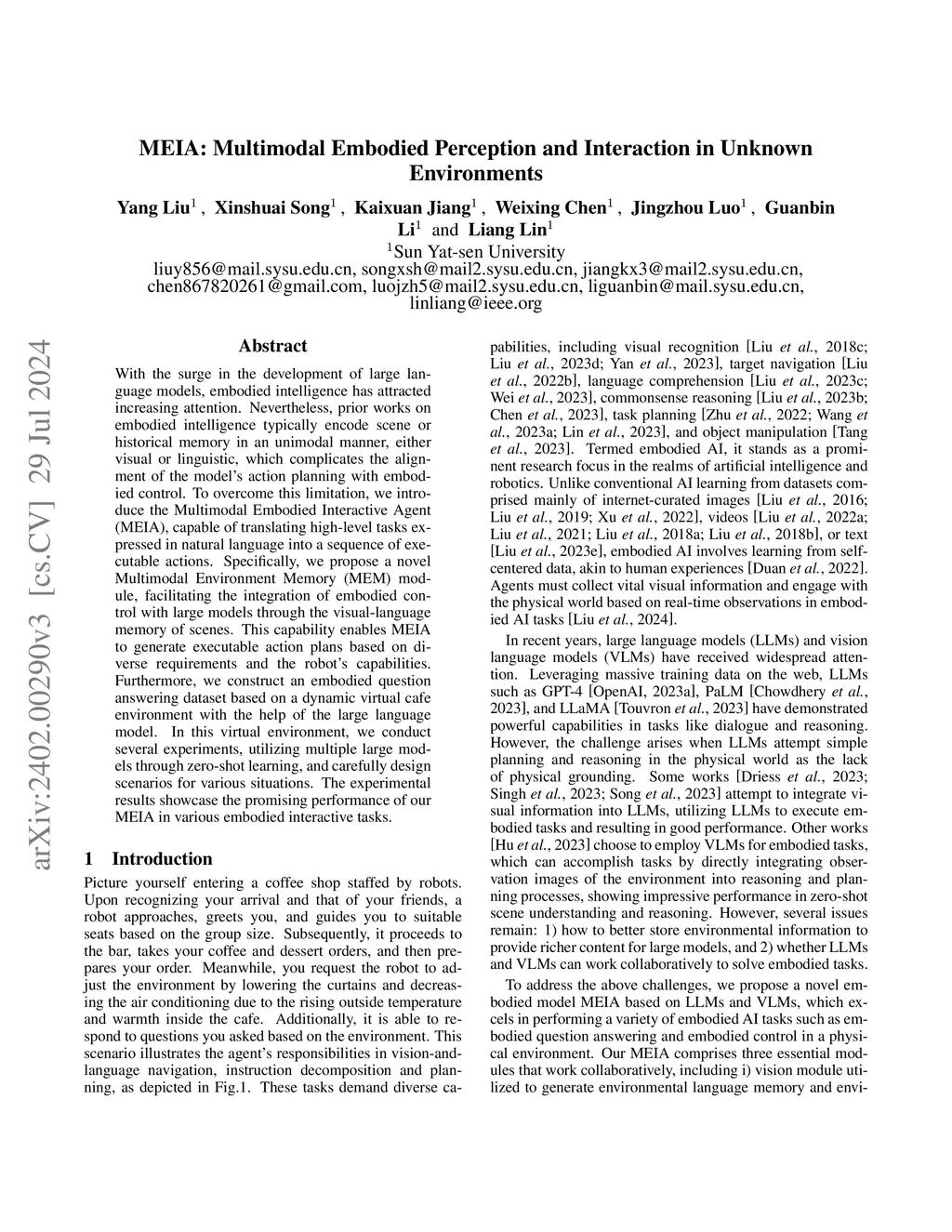 With the surge in the development of large language models, embodied intelligence has attracted increasing attention. Nevertheless, prior works on embodied intelligence typically encode scene or historical memory in an unimodal manner, either visual or linguistic, which complicates the alignment of the model's action planning with embodied control. To overcome this limitation, we introduce the Multimodal Embodied Interactive Agent (MEIA), capable of translating high-level tasks expressed in natural language into a sequence of executable actions. Specifically, we propose a novel Multimodal Environment Memory (MEM) module, facilitating the integration of embodied control with large models through the visual-language memory of scenes. This capability enables MEIA to generate executable action plans based on diverse requirements and the robot's capabilities. Furthermore, we construct an embodied question answering dataset based on a dynamic virtual cafe environment with the help of the large language model. In this virtual environment, we conduct several experiments, utilizing multiple large models through zero-shot learning, and carefully design scenarios for various situations. The experimental results showcase the promising performance of our MEIA in various embodied interactive tasks.