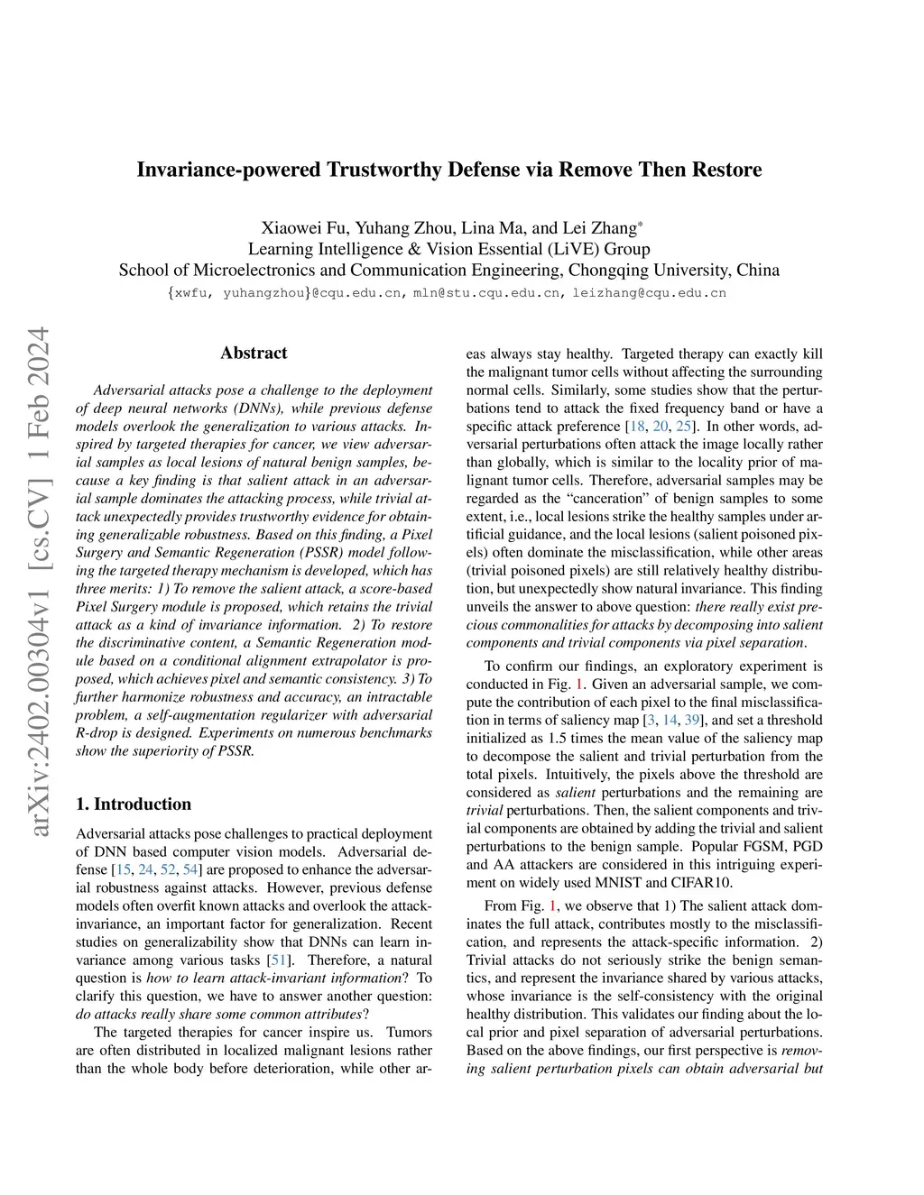 Adversarial attacks pose a challenge to the deployment of deep neural networks (DNNs), while previous defense models overlook the generalization to various attacks. Inspired by targeted therapies for cancer, we view adversarial samples as local lesions of natural benign samples, because a key finding is that salient attack in an adversarial sample dominates the attacking process, while trivial attack unexpectedly provides trustworthy evidence for obtaining generalizable robustness. Based on this finding, a Pixel Surgery and Semantic Regeneration (PSSR) model following the targeted therapy mechanism is developed, which has three merits: 1) To remove the salient attack, a score-based Pixel Surgery module is proposed, which retains the trivial attack as a kind of invariance information. 2) To restore the discriminative content, a Semantic Regeneration module based on a conditional alignment extrapolator is proposed, which achieves pixel and semantic consistency. 3) To further harmonize robustness and accuracy, an intractable problem, a self-augmentation regularizer with adversarial R-drop is designed. Experiments on numerous benchmarks show the superiority of PSSR.