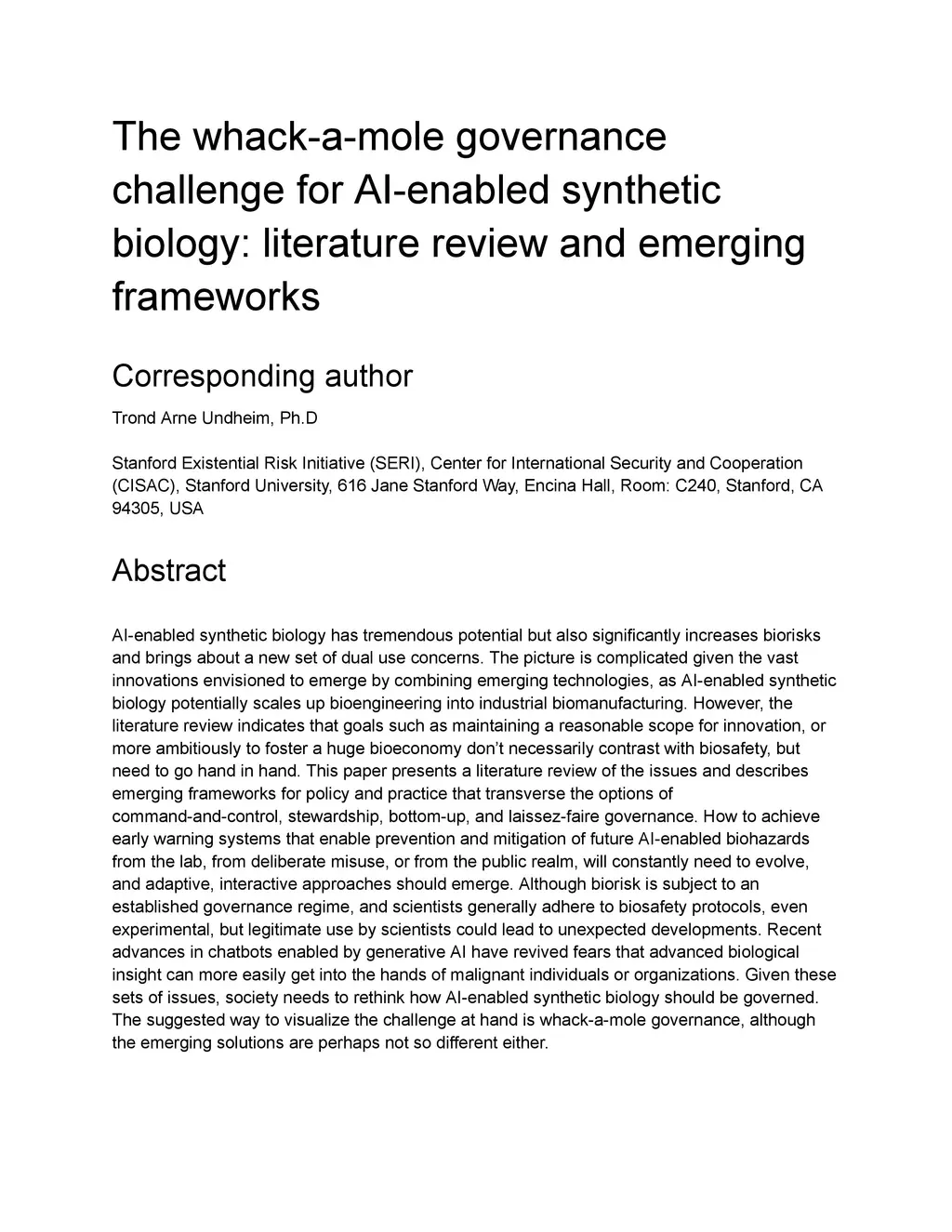 AI-enabled synthetic biology has tremendous potential but also significantly increases biorisks and brings about a new set of dual use concerns. The picture is complicated given the vast innovations envisioned to emerge by combining emerging technologies, as AI-enabled synthetic biology potentially scales up bioengineering into industrial biomanufacturing. However, the literature review indicates that goals such as maintaining a reasonable scope for innovation, or more ambitiously to foster a huge bioeconomy don't necessarily contrast with biosafety, but need to go hand in hand. This paper presents a literature review of the issues and describes emerging frameworks for policy and practice that transverse the options of command-and control, stewardship, bottom-up, and laissez-faire governance. How to achieve early warning systems that enable prevention and mitigation of future AI-enabled biohazards from the lab, from deliberate misuse, or from the public realm, will constantly need to evolve, and adaptive, interactive approaches should emerge. Although biorisk is subject to an established governance regime, and scientists generally adhere to biosafety protocols, even experimental, but legitimate use by scientists could lead to unexpected developments. Recent advances in chatbots enabled by generative AI have revived fears that advanced biological insight can more easily get into the hands of malignant individuals or organizations. Given these sets of issues, society needs to rethink how AI-enabled synthetic biology should be governed. The suggested way to visualize the challenge at hand is whack-a-mole governance, although the emerging solutions are perhaps not so different either.