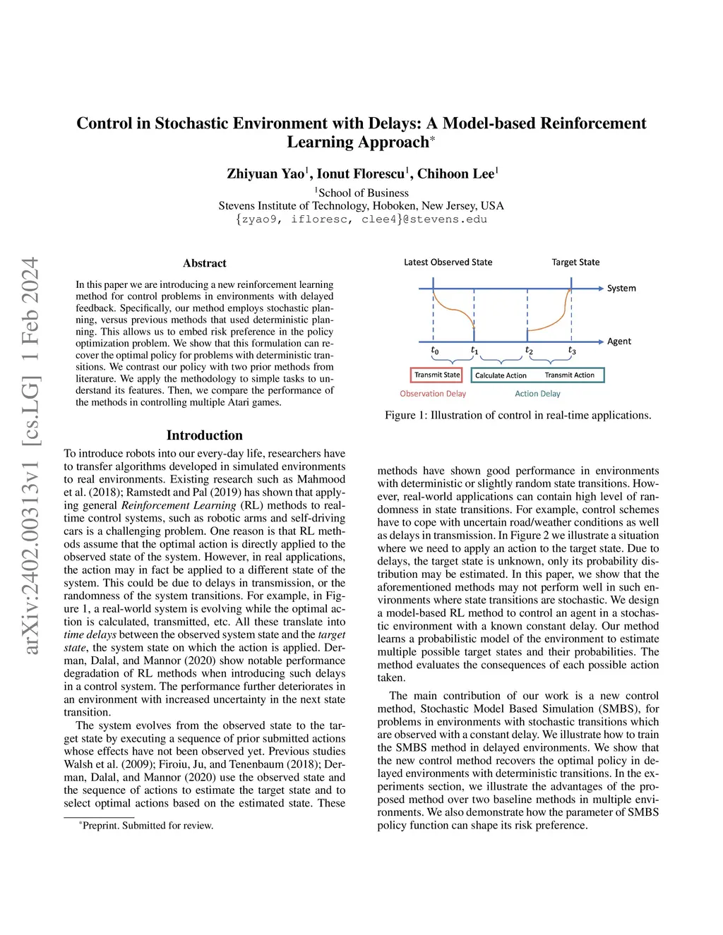 In this paper we are introducing a new reinforcement learning method for control problems in environments with delayed feedback. Specifically, our method employs stochastic planning, versus previous methods that used deterministic planning. This allows us to embed risk preference in the policy optimization problem. We show that this formulation can recover the optimal policy for problems with deterministic transitions. We contrast our policy with two prior methods from literature. We apply the methodology to simple tasks to understand its features. Then, we compare the performance of the methods in controlling multiple Atari games.