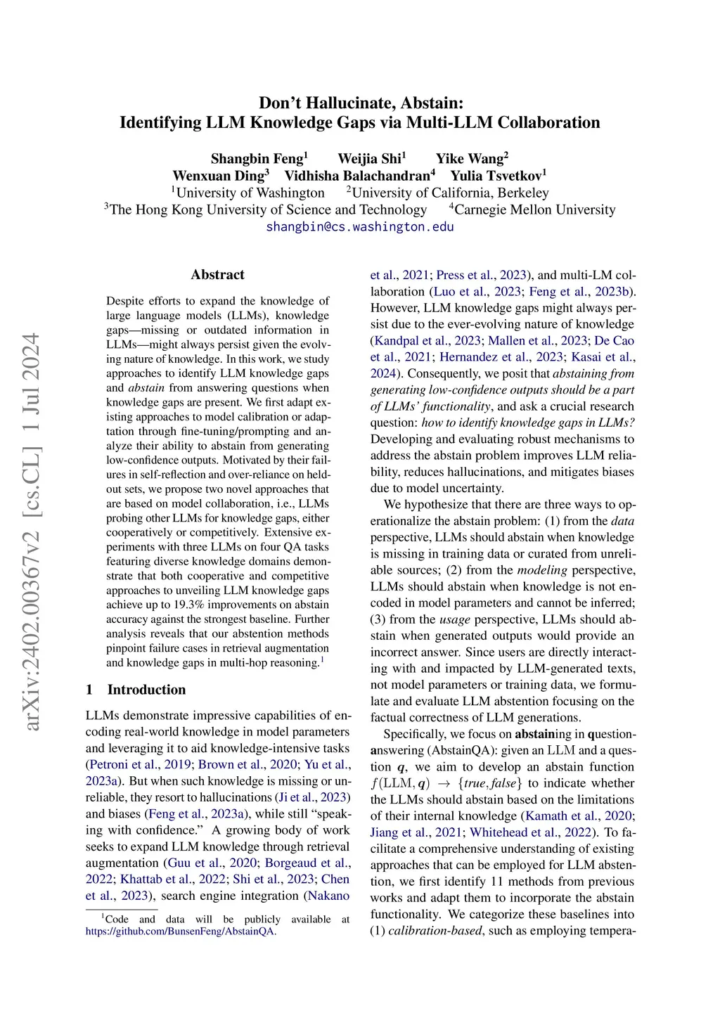 Despite efforts to expand the knowledge of large language models (LLMs), knowledge gaps -- missing or outdated information in LLMs -- might always persist given the evolving nature of knowledge. In this work, we study approaches to identify LLM knowledge gaps and abstain from answering questions when knowledge gaps are present. We first adapt existing approaches to model calibration or adaptation through fine-tuning/prompting and analyze their ability to abstain from generating low-confidence outputs. Motivated by their failures in self-reflection and over-reliance on held-out sets, we propose two novel approaches that are based on model collaboration, i.e., LLMs probing other LLMs for knowledge gaps, either cooperatively or competitively. Extensive experiments with three LLMs on four QA tasks featuring diverse knowledge domains demonstrate that both cooperative and competitive approaches to unveiling LLM knowledge gaps achieve up to 19.3% improvements on abstain accuracy against the strongest baseline. Further analysis reveals that our proposed mechanisms could help identify failure cases in retrieval augmentation and pinpoint knowledge gaps in multi-hop reasoning.