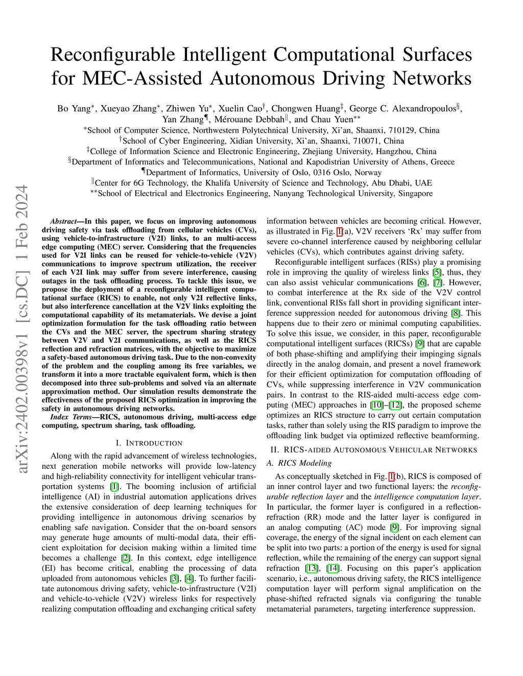 In this paper, we focus on improving autonomous driving safety via task offloading from cellular vehicles (CVs), using vehicle-to-infrastructure (V2I) links, to an multi-access edge computing (MEC) server. Considering that the frequencies used for V2I links can be reused for vehicle-to-vehicle (V2V) communications to improve spectrum utilization, the receiver of each V2I link may suffer from severe interference, causing outages in the task offloading process. To tackle this issue, we propose the deployment of a reconfigurable intelligent computational surface (RICS) to enable, not only V2I reflective links, but also interference cancellation at the V2V links exploiting the computational capability of its metamaterials. We devise a joint optimization formulation for the task offloading ratio between the CVs and the MEC server, the spectrum sharing strategy between V2V and V2I communications, as well as the RICS reflection and refraction matrices, with the objective to maximize a safety-based autonomous driving task. Due to the non-convexity of the problem and the coupling among its free variables, we transform it into a more tractable equivalent form, which is then decomposed into three sub-problems and solved via an alternate approximation method. Our simulation results demonstrate the effectiveness of the proposed RICS optimization in improving the safety in autonomous driving networks.