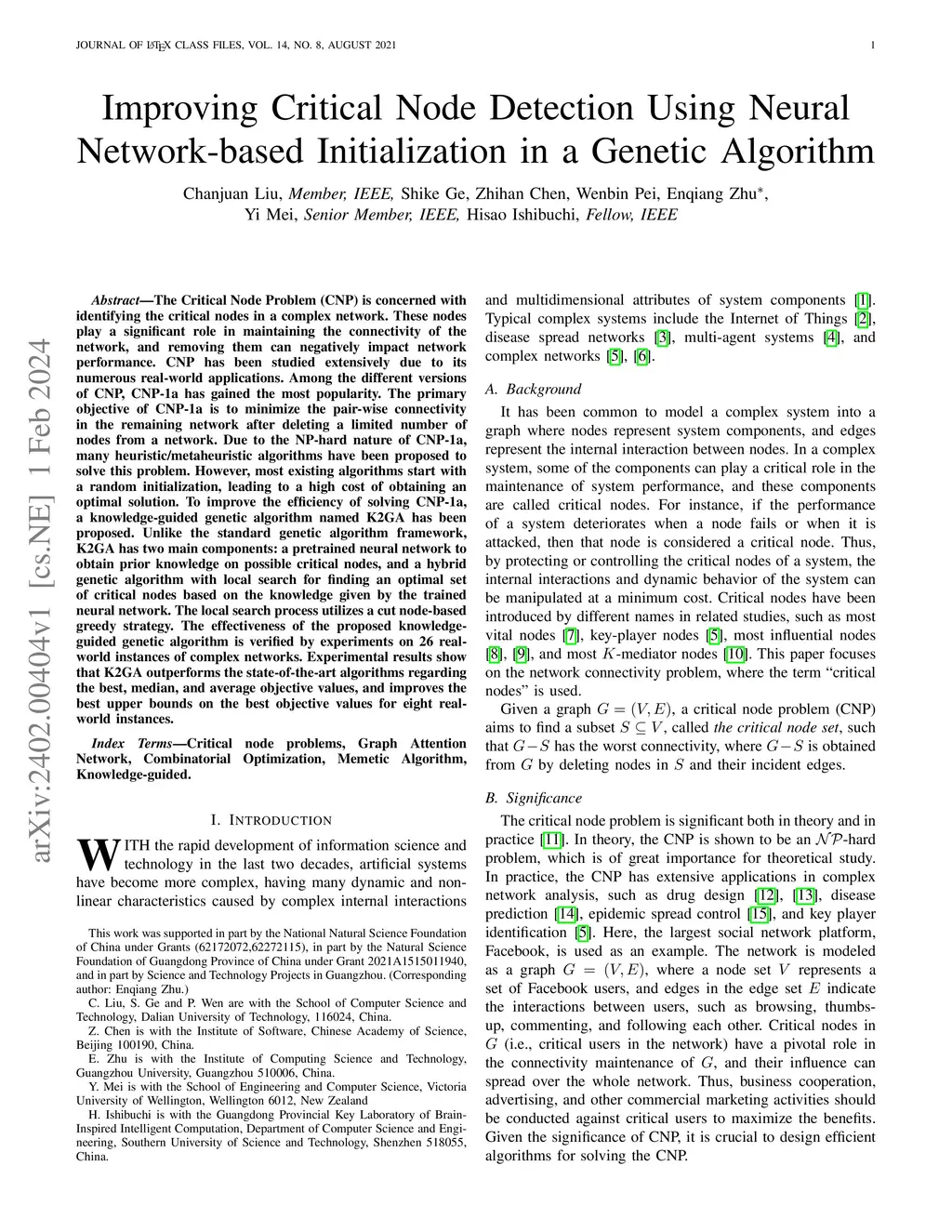 The Critical Node Problem (CNP) is concerned with identifying the critical nodes in a complex network. These nodes play a significant role in maintaining the connectivity of the network, and removing them can negatively impact network performance. CNP has been studied extensively due to its numerous real-world applications. Among the different versions of CNP, CNP-1a has gained the most popularity. The primary objective of CNP-1a is to minimize the pair-wise connectivity in the remaining network after deleting a limited number of nodes from a network. Due to the NP-hard nature of CNP-1a, many heuristic/metaheuristic algorithms have been proposed to solve this problem. However, most existing algorithms start with a random initialization, leading to a high cost of obtaining an optimal solution. To improve the efficiency of solving CNP-1a, a knowledge-guided genetic algorithm named K2GA has been proposed. Unlike the standard genetic algorithm framework, K2GA has two main components: a pretrained neural network to obtain prior knowledge on possible critical nodes, and a hybrid genetic algorithm with local search for finding an optimal set of critical nodes based on the knowledge given by the trained neural network. The local search process utilizes a cut node-based greedy strategy. The effectiveness of the proposed knowledgeguided genetic algorithm is verified by experiments on 26 realworld instances of complex networks. Experimental results show that K2GA outperforms the state-of-the-art algorithms regarding the best, median, and average objective values, and improves the best upper bounds on the best objective values for eight realworld instances.
