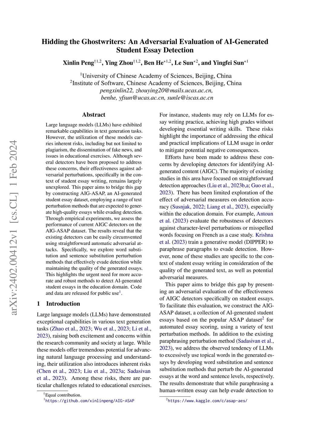 Large language models (LLMs) have exhibited remarkable capabilities in text generation tasks. However, the utilization of these models carries inherent risks, including but not limited to plagiarism, the dissemination of fake news, and issues in educational exercises. Although several detectors have been proposed to address these concerns, their effectiveness against adversarial perturbations, specifically in the context of student essay writing, remains largely unexplored. This paper aims to bridge this gap by constructing AIG-ASAP, an AI-generated student essay dataset, employing a range of text perturbation methods that are expected to generate high-quality essays while evading detection. Through empirical experiments, we assess the performance of current AIGC detectors on the AIG-ASAP dataset. The results reveal that the existing detectors can be easily circumvented using straightforward automatic adversarial attacks. Specifically, we explore word substitution and sentence substitution perturbation methods that effectively evade detection while maintaining the quality of the generated essays. This highlights the urgent need for more accurate and robust methods to detect AI-generated student essays in the education domain.