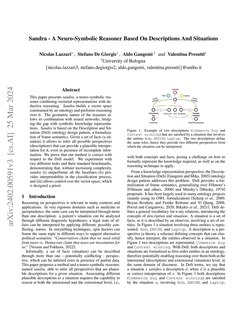 This paper presents sandra, a neuro-symbolic reasoner combining vectorial representations with deductive reasoning. Sandra builds a vector space constrained by an ontology and performs reasoning over it. The geometric nature of the reasoner allows its combination with neural networks, bridging the gap with symbolic knowledge representations. Sandra is based on the Description and Situation (DnS) ontology design pattern, a formalization of frame semantics. Given a set of facts (a situation) it allows to infer all possible perspectives (descriptions) that can provide a plausible interpretation for it, even in presence of incomplete information. We prove that our method is correct with respect to the DnS model. We experiment with two different tasks and their standard benchmarks, demonstrating that, without increasing complexity, sandra (i) outperforms all the baselines (ii) provides interpretability in the classification process, and (iii) allows control over the vector space, which is designed a priori.