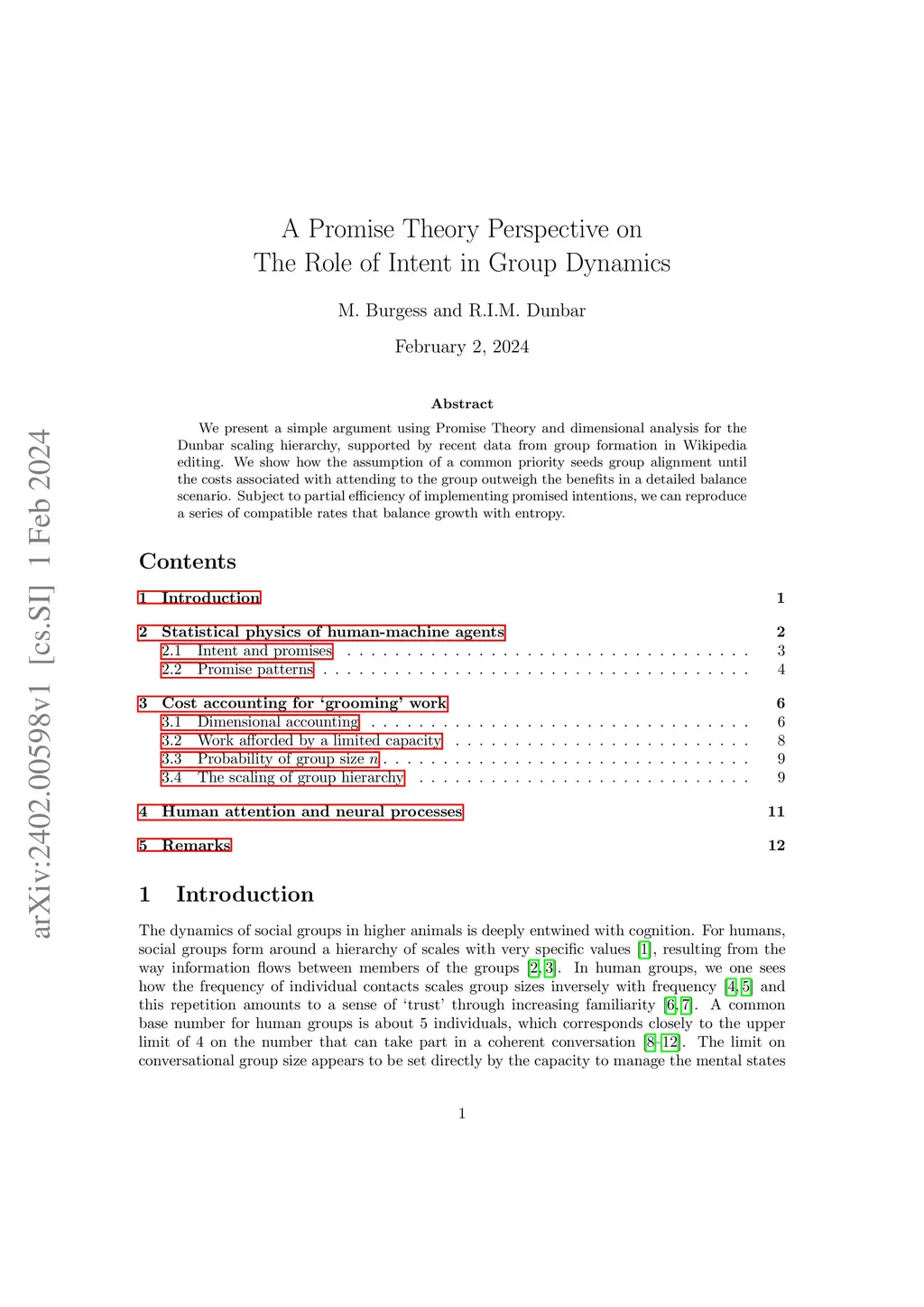 We present a simple argument using Promise Theory and dimensional analysis for the Dunbar scaling hierarchy, supported by recent data from group formation in Wikipedia editing. We show how the assumption of a common priority seeds group alignment until the costs associated with attending to the group outweigh the benefits in a detailed balance scenario. Subject to partial efficiency of implementing promised intentions, we can reproduce a series of compatible rates that balance growth with entropy.